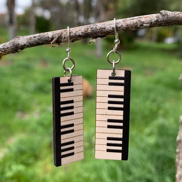 Beautiful whimsical white washed wooden earrings adorned with embossed silver music notes.