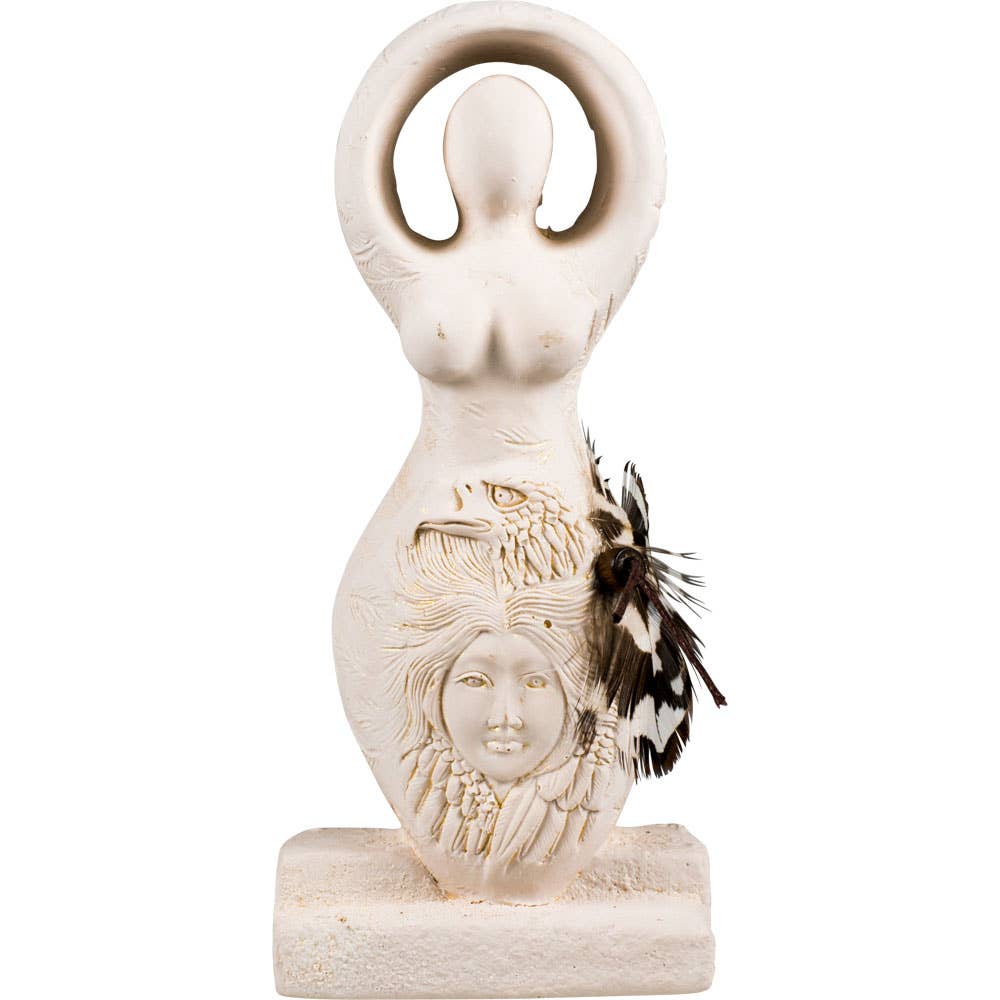Crafted in Canada, this Gypsum Cement Figurine of the Shaman Goddess is designed to embody nurturing energy, balance, and connection to both the earth and the heavens. The swirling carved feathers around her body symbolize her link to the spiritual realm and her grounding presence on earth. The turquoise-colored beads represent harmony and healing, bringing forth balance and positive energy. This figurine embodies the essence of natural wellness and serves as a meaningful addition to your sacred space, inspiring mindfulness and spiritual growth. ⚠️CA Warning: Can expose you to Lead and lead compounds, a carcinogen and reproductive toxicant. See www.P65Warnings.ca.gov.