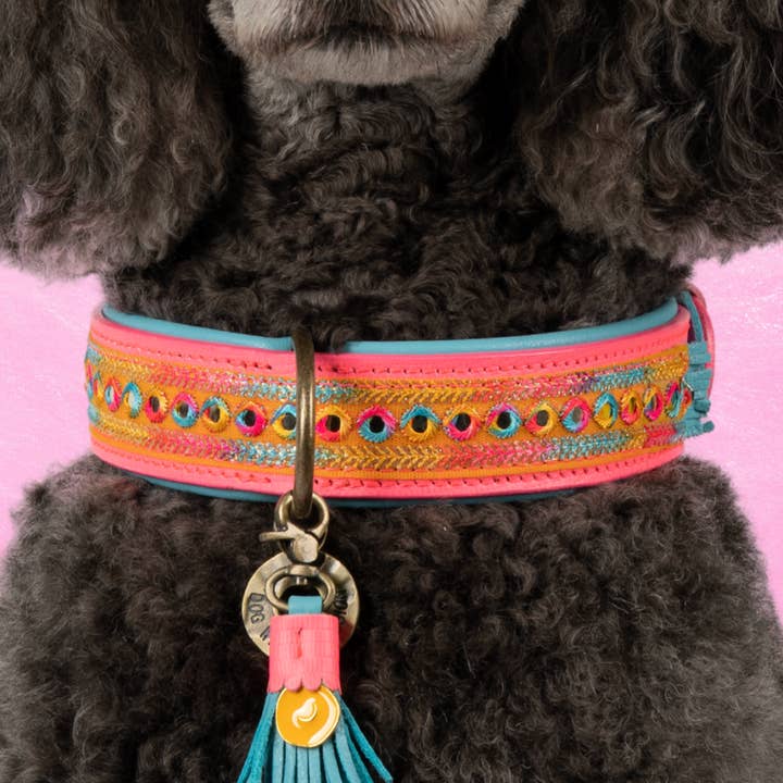 Gypsy Dog Collar The Gypsy dog collar is a handmade eye-catcher with a cheerful boho look. Thanks to the warm tones, colorful details, and luxurious finish, this model immediately attracts attention in your store and appeals to customers who love style and quality. ❤︎ Original Dog with a Mission® design with high recognition value ❤︎ Handmade collar made of sturdy harness leather with soft nubuck on the inside ❤︎ Comfortable and durable – perfect for daily use ❤︎ Sturdy brass fittings for a luxurious look ❤︎ Available in sizes XXS to XL The Gypsy combines playful cheerfulness with high-quality craftsmanship and perfectly meets the demand for unique and sustainable dog accessories. Pair with the matching Gypsy dog leash for a complete presentation that boosts sales.