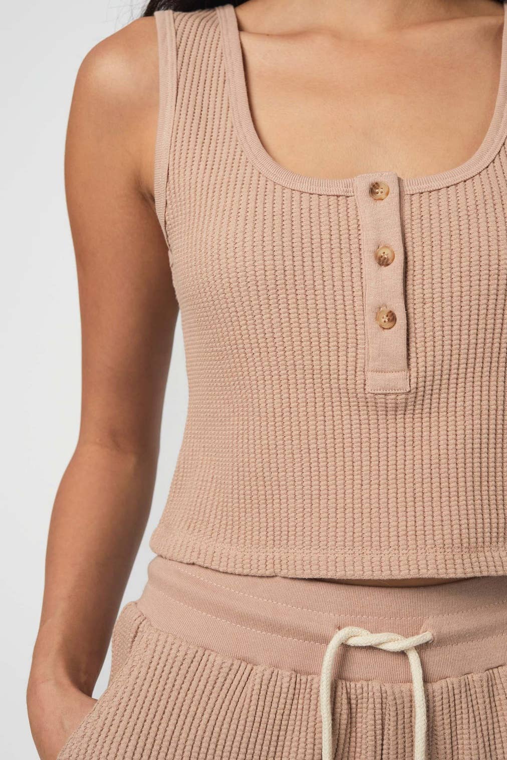 Size: One Size. Ribbed knit top featuring a v-neckline and cropped silhouette. Fabric: 92% Nylon / 8% Spandex. Made in the USA Our best selling top featuring a seamless construction, vintage washed, v-neck and shoulder straps.