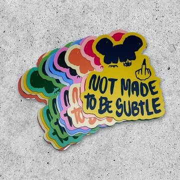 Inspired by our bestselling greeting cards, this small bumper sticker is sure to bring laughs to your customers. ***************************** Sticker Size: Approx in 2 in tall ( cm) x 4 (cm) wide Materials: All-Weather Vinyl Stickers Special Instructions: Do not run through the dishwasher to extend life of these stickers! All-weather vinyl is generally resistant to water, dirt and light. But to preserve the lifespan of your stickers, it's best to keep them protected from these elements. STICKERS ARE SOLD IN CASES OF 5 - SUGGESTED RETAIL PER STICKER IS $5.00 ***************************** Funguise is a trademark of Wicked West LLC Sticker Designs by Brenda West (c) 2023