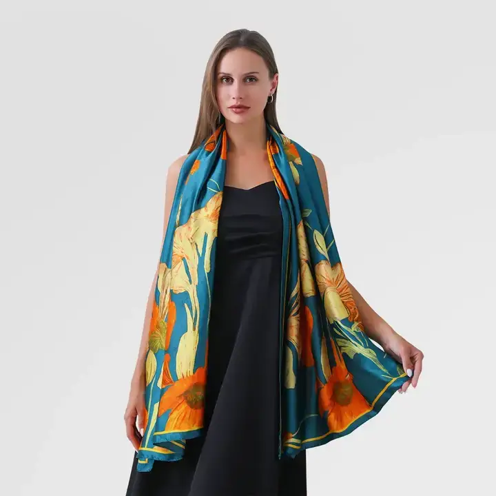 Teal Floral Faux Silk Scarf