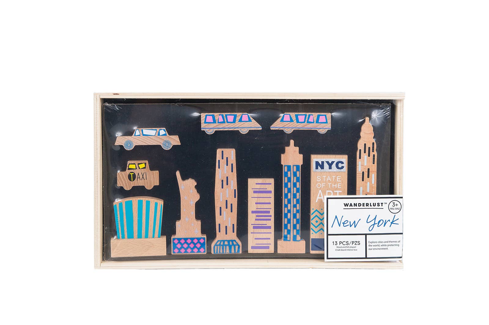 Wanderlust Hollywood Wanderlust is a beautifully designed handcrafted wood and felt themed playset. Complete with the monuments and magnificent architectures of its' iconic city. Wanderlust will inspire and delight any bookshelf, classroom, or individual it comes into play with. Collect them all! NOW INCLUDES FUN FACTS! Includes: FUN FACTS Includes 9 block pieces Chalkboard painted interior designed for creating a landscape backdrop Wooden Storage Laser-Engraved Box (11X7X2 inches) High-quality design for lasting durability. Our mission at Once-Kids is to make toys that kids make their own while helping save our world's oceans.