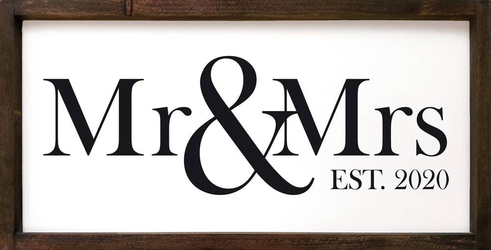 Mr & Mrs. - Height: 5 1/4" (not including the ribbon) - Width: 8 1/2" - Thickness: 1/8" - Making it very light and easy to hang just about anywhere. - Paint: Acrylic paint with an eggshell finish. It can be cleaned with a damp cloth. - Material: MDF (medium density fiberboard) is made with pressed sawdust and is a sustainable forest product. - Lettering: Our lettering is printed with ink, it is not vinyl. - Packaging: Each sign is shipped in a clear cellophane bag with a hang tab (see photo in ad).