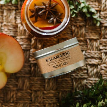Wrap your hands around a mug of spiced apple cider with the steamy aroma of juicy red apples simmering on the stove with mulling spices like a warm cinnamon, spicy clove, and a sweet dash of nutmeg. 6oz Travel Tins are perfect for smaller spaces or to add to your overnight bag. All of our candles are hand poured in small batches using all-natural soy wax. Travel Tins burn for approximately 35 hours. 3â…›"w x 2"h.