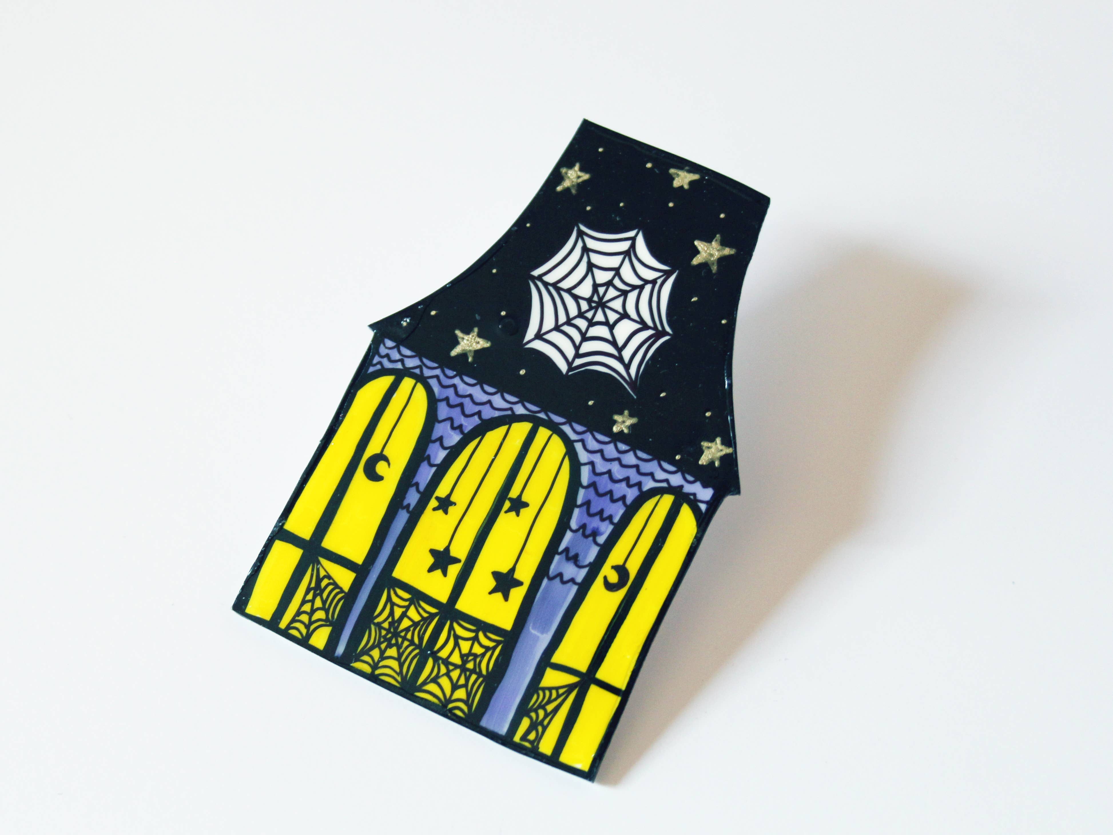 A 100% handmade and illustrated brooch of a spooky house with spiderweb windows and a beaming red eye. Made from durable plastic and original drawing protected by a clear resin-like coat. Because these are hand drawn, no two brooches are the same, each is a one of a kind piece. Measures approx 1.75 inches wide with two tacks with rubber backings affixed to the back.
