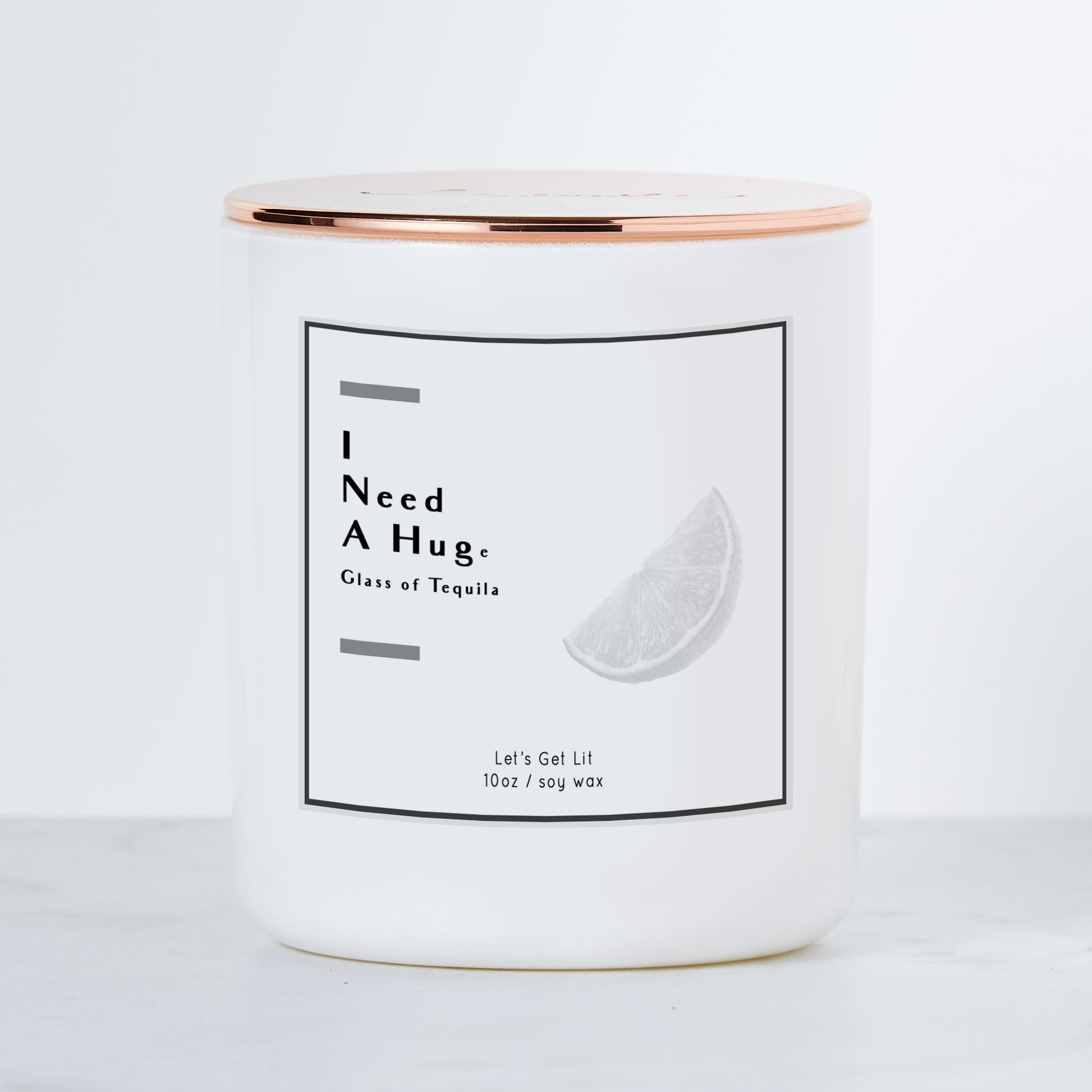 I Need A Huge Glass of Tequila - Luxe Scented Soy Candle Get your point across in a high-end, lady like way. - White wax. - 3 x 3.5 Inches. - 10oz soy blend wax. - Luxury Glass White Gloss Vessel. - Rose Gold Cap - Hand poured in NJ. *Due to a manufacturing shortage, only silver caps are currently available (not the rose gold). Scent: Margarita An energizing burst of sweet, salty, and tart citrus with a shot of tequila. Immerse yourself in the feeling of a sizzling hot day with fresh squeezed lime, coarse sea salt, and ozonic airy top notes.