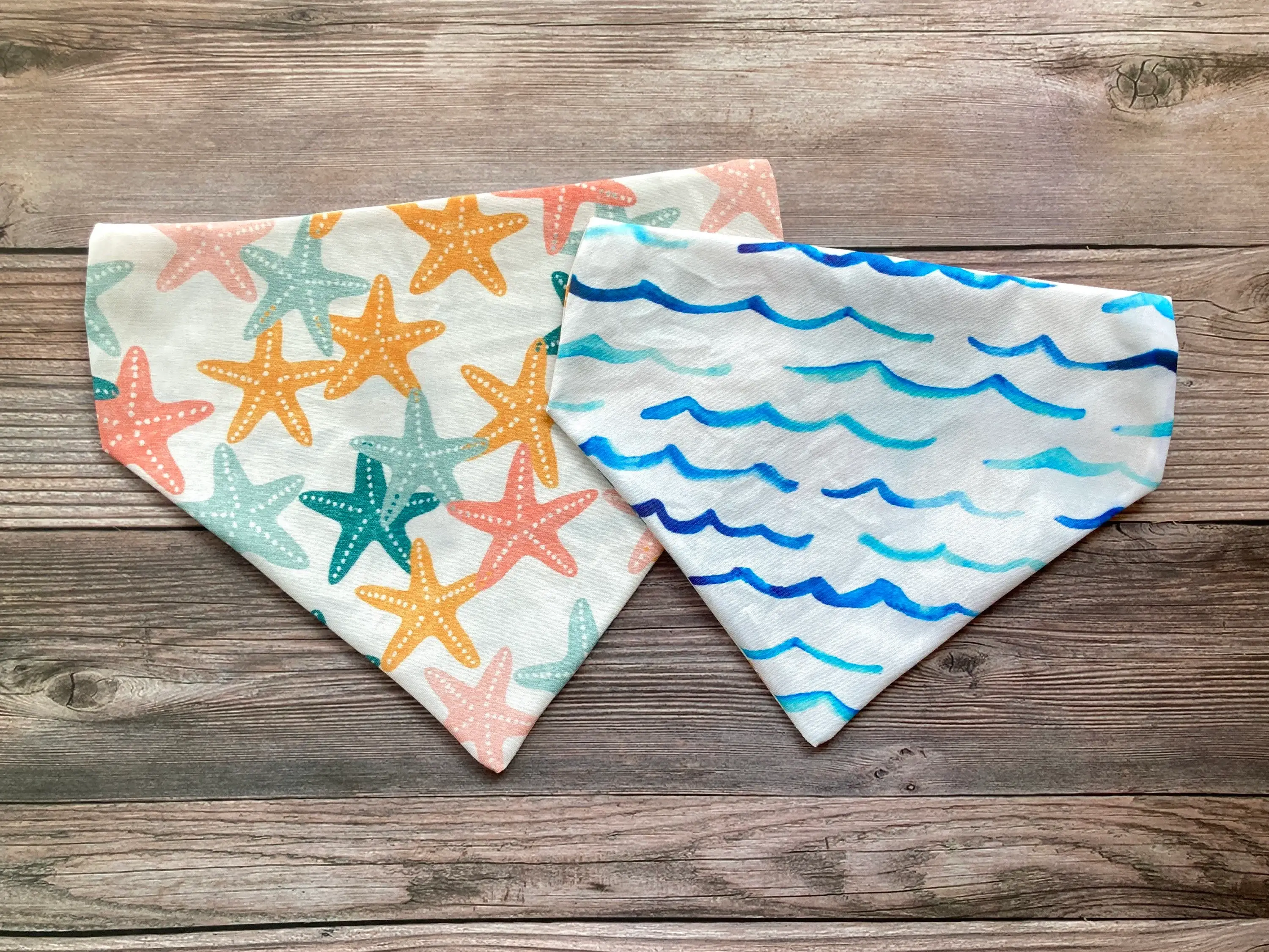 Patterns may be going in different directions, depending on cut of fabric. These bandanas are all handmade and there may be slight imperfections and measurements may vary slightly. Care Tips: Hand wash only, air dry ----------------------Sizing------------------------- Please message me if you have any questions about sizing or need help sizing your pet. Over the Collar Bandanas These bandanas slip easily over your pets collar. There is no need to worry about it falling off or tying it too tight around their neck! Remember the buckle on the collar is usually the widest part and is what will need to fit through the opening. I would go a few inches smaller then your full collar length. Extra Small- Collar Size 2” , 7” width, hangs 5"(Dachshunds, Chihuahuas, cats) Small- Collar Size 2 " , 8 1/2" width, hangs 6.5" ( Corgis, Pomskies, Small Breeds, Pomeranians, Beagles) Medium- Collar Size 2”, 11” width, hangs 8" (Huskies, German Shepards, Dobermans) Large- Collar Size 2", 14" width
