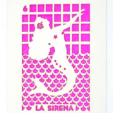 " Loteria! " is one of the few Spanish words I remember learning in my 7th grade Spanish class. Loteria basically is like Bingo except with colorful images. La Sirena is one of our favorites cards Laser cut card with colored tissue paper backing. Blank on the inside Individual cards come in a protective compostable PLA sleeve card size - A7 5" x 7" A2 4.25'' x 5.5''