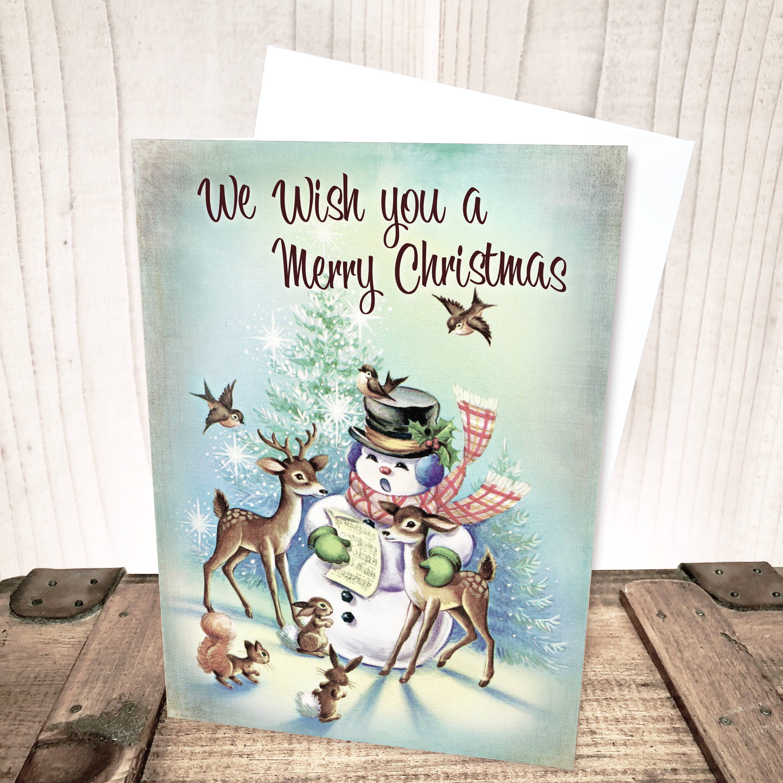 A bit of Americana history creates warmth during the winter season with this Christmas card. A sweet little angel plays a Christmas horn for three little red birds. It includes hand-painted sparkles throughout the snowy ground. This Christmas greeting card is 5" x 7" and made in the USA with quality, earth-friendly materials. The inside is blank, leaving ample room for a personal message or note, and to include a photograph. It comes packaged individually with an enclosed envelope.