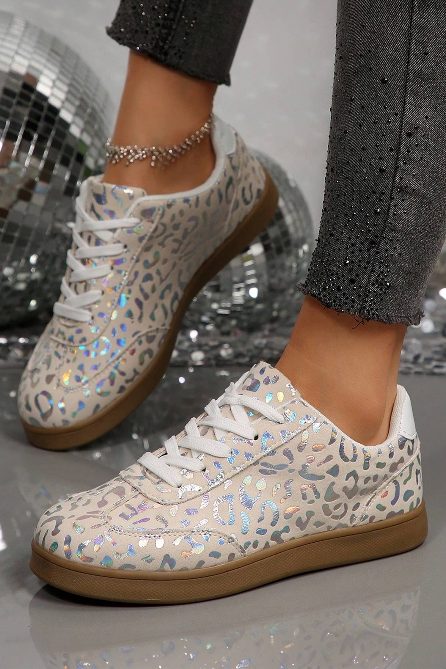 Sneaker with contrasting laces, tongue with beading, color-coordinated back and side with animal print.