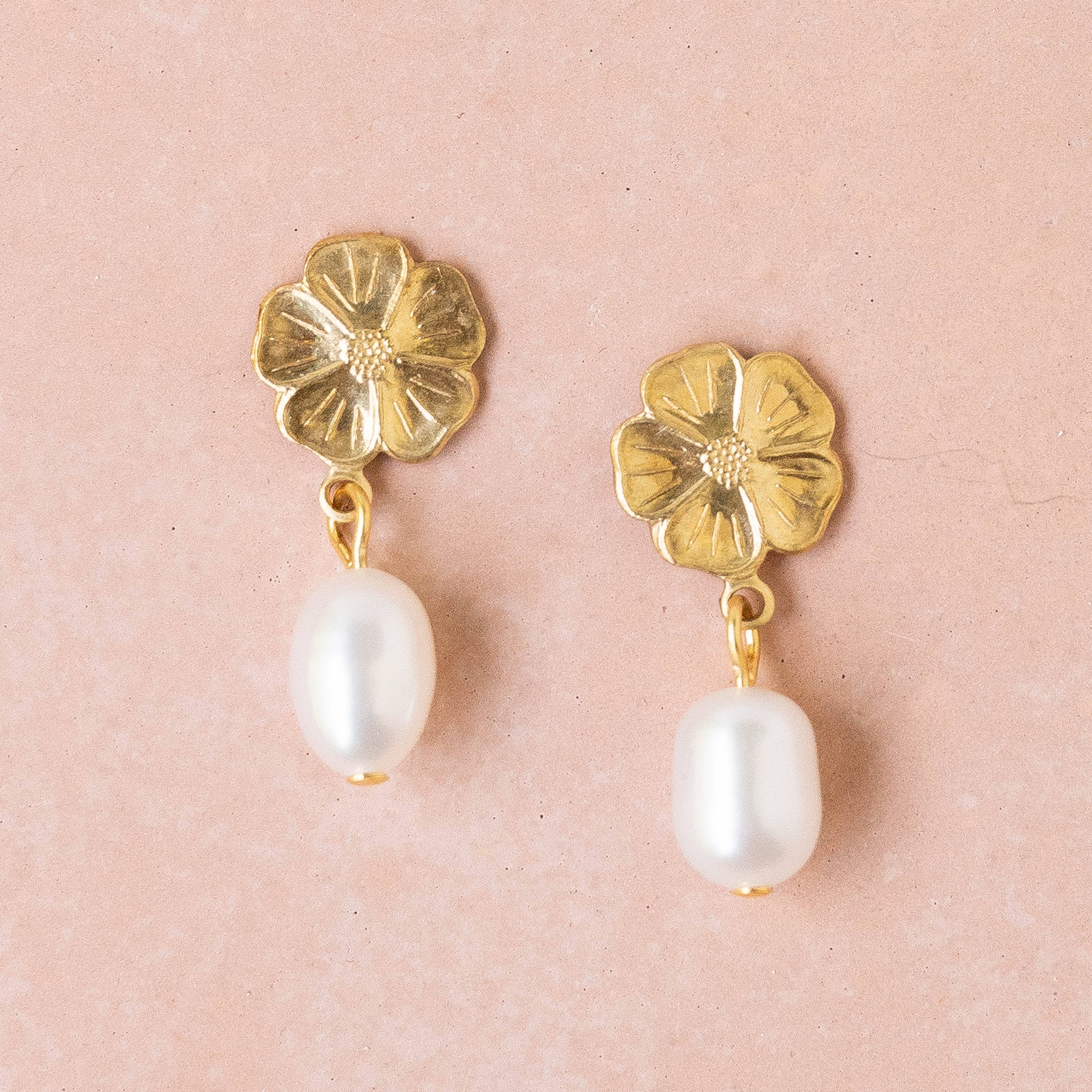 Small floral and Pearl stud earrings in golden brass with beautiful engraved detail, the ear backs are 14K Gold Plated with gold plated closures. The little 6mm pearls are Preciosa Glass Crystals pearls.