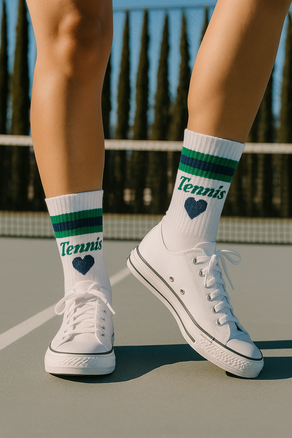 Our Sweat Sette Gym Sock. This nostalgic design is meant to be dressed up or down and features a thick terry insole for added comfort and our iconic racket embroidery on each side. Our socks are ethically made in earth friendly fabrics, and a tree is planted for every pair.