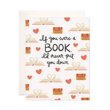 Outside: book lovers unite. Inside: blank. Size: (A2) 4.25 x 5.5. Paper: white, recycled, heavyweight. Envelope: matching, recycled. Comes in a clear, protective sleeve. Yay books!