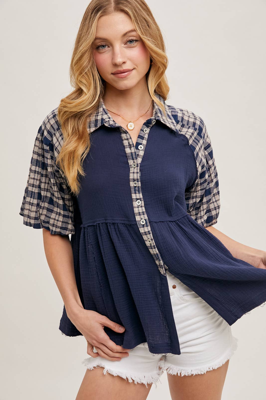 The denim zipper front bomber jacket is a stylish and versatile outerwear piece that combines the classic appeal of denim with the modern design of a bomber jacket. This jacket features a front zipper closure, giving it a contemporary and edgy vibe. The denim fabric adds a casual and timeless element, making it suitable for various occasions. The bomber jacket style typically includes ribbed cuffs and hem, providing a snug fit and a sporty look. With its zipper detailing and denim construction, this jacket effortlessly blends urban chic with casual comfort. It's a perfect choice for adding a trendy layer to your outfit while staying comfortable and on-trend. Whether paired with jeans for a double denim look or styled with a dress for a more eclectic ensemble, the denim zipper front bomber jacket is a versatile and fashion-forward choice for your wardrobe. -Lookbook photo bottom pair with B02040 -Model is 5'9" and wearing a Small