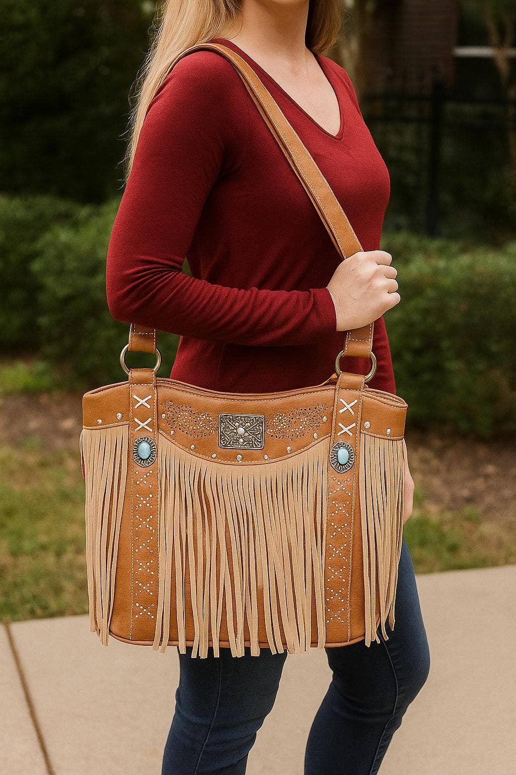 Crafted from genuine cowhide and leather, this crossbody bag showcases a unique turquoise heart stone design. With a compact size of 8"x5.5", it's both stylish and practical for on-the-go use. Each cowhide pattern is unique, making it a one-of-a-kind accessory. wholesale inquires: www.facebook.com/groups/broadsmarketwholesale