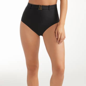 Dare to bear it. Wear the Daring Debbie Bikini Bottoms. A new 2020, addition, these not-so-basic black bikini bottoms get attention because of the contrast geometric print ruffle detail that starts along the front and gradually makes it was to your cheeks. Designed for babes, who want a Brazilian bottom with a semi-cheeky feel. Keep your cheeks covered--somewhat--but show off a little too. Whats more is you can rock these high on the hip for even more sass. You, ready? Our signature Buttery Soft Fabric Brazilian cut, with semi-cheeky detail Banded sides