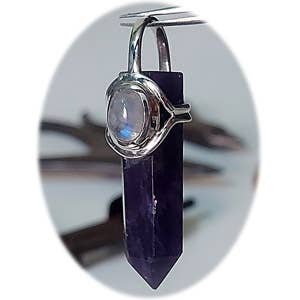 A jade and Rainbow Moonstone hand made sterling silver symbolic Healer wand Point. - Jade is the ultimate Dream Stone, revered in ancient cultures, as well as today, to access the spiritual world. Jade is a highly valued natural metaphysical stone that symbolizes gentleness, serenity, harmony, and balance in feng shui, or the practice of bringing balance to your life and home with energy. Jade has many meanings, including strength, luck, and good health. Jade is also revered for its healing properties balancing the body's processesRainbow Moonstone helps calm stress and overreaction. It brings hope, enhances feminine energies, sensitivity, intuition, and psychic abilities. . . . Crystal Earth has supplied Sterling Silver and Natural Stone Jewelry to New Age, Metaphysical, Spiritual and Life Style stores for 35 years . . . each design comes with it's own 1 year workmanship replacement warranty card