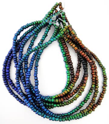 Flat round shaped millefiori glass beads in mixed colors with spiral/concentric circle detail. Bead sizes available: approx. 6mm, 8mm, and 10mm Hole size: approx. .8 mm - 1 mm Quantity per strand (approximately) -6mm: 65 -8mm: 45 -10: 35 Due to the nature of glass beads, some imperfections in the beads may be present.