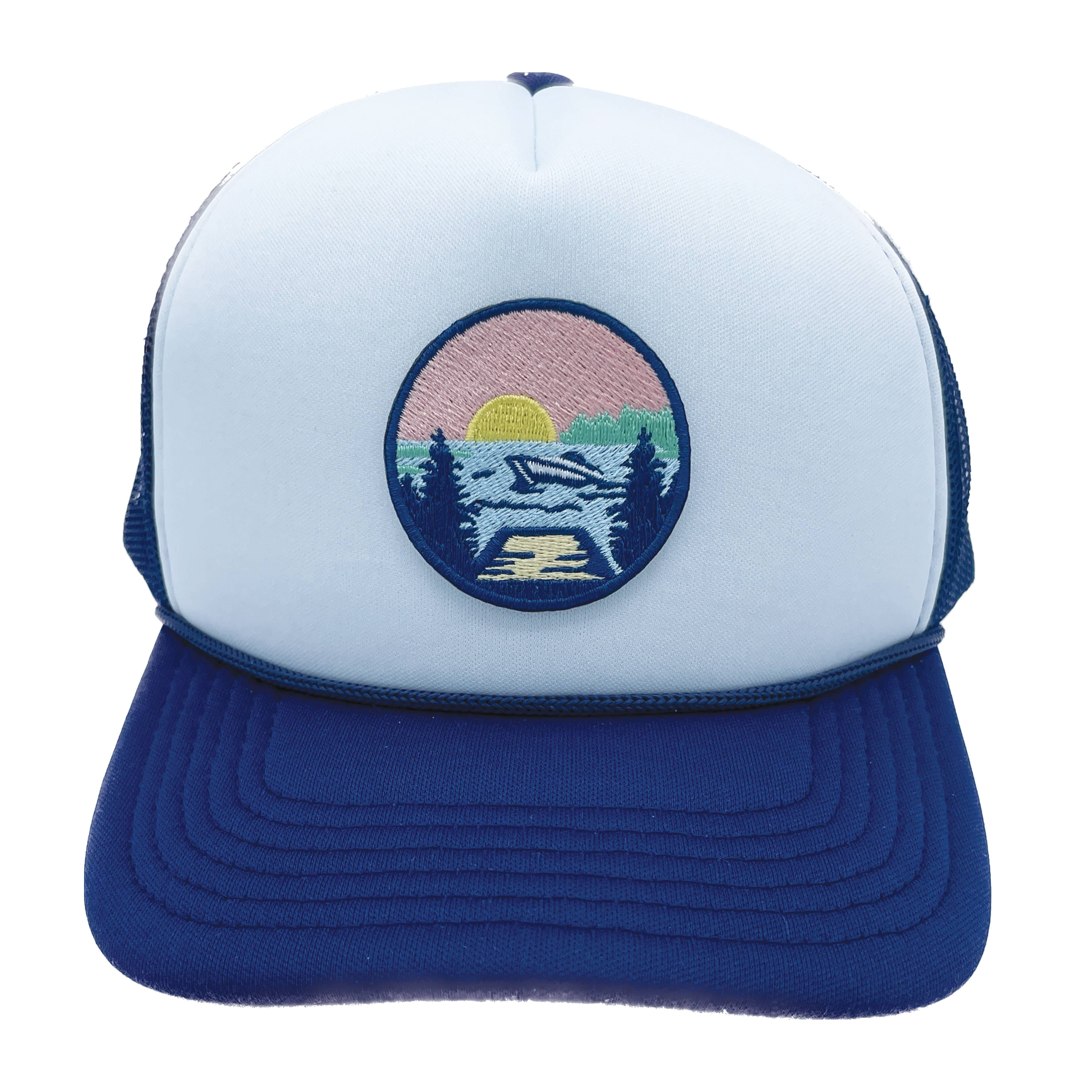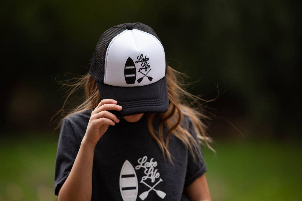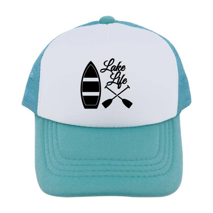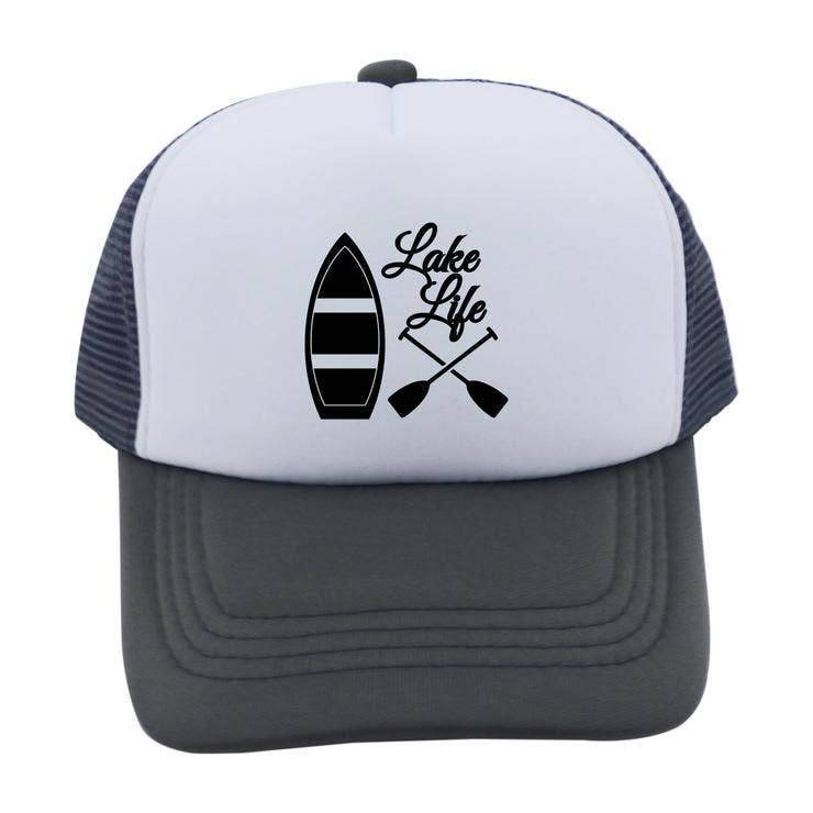 Our lake life design on a hat customized to your color choice and size. These are a trucker style hat made from polyester foam with adjustable snap closure.