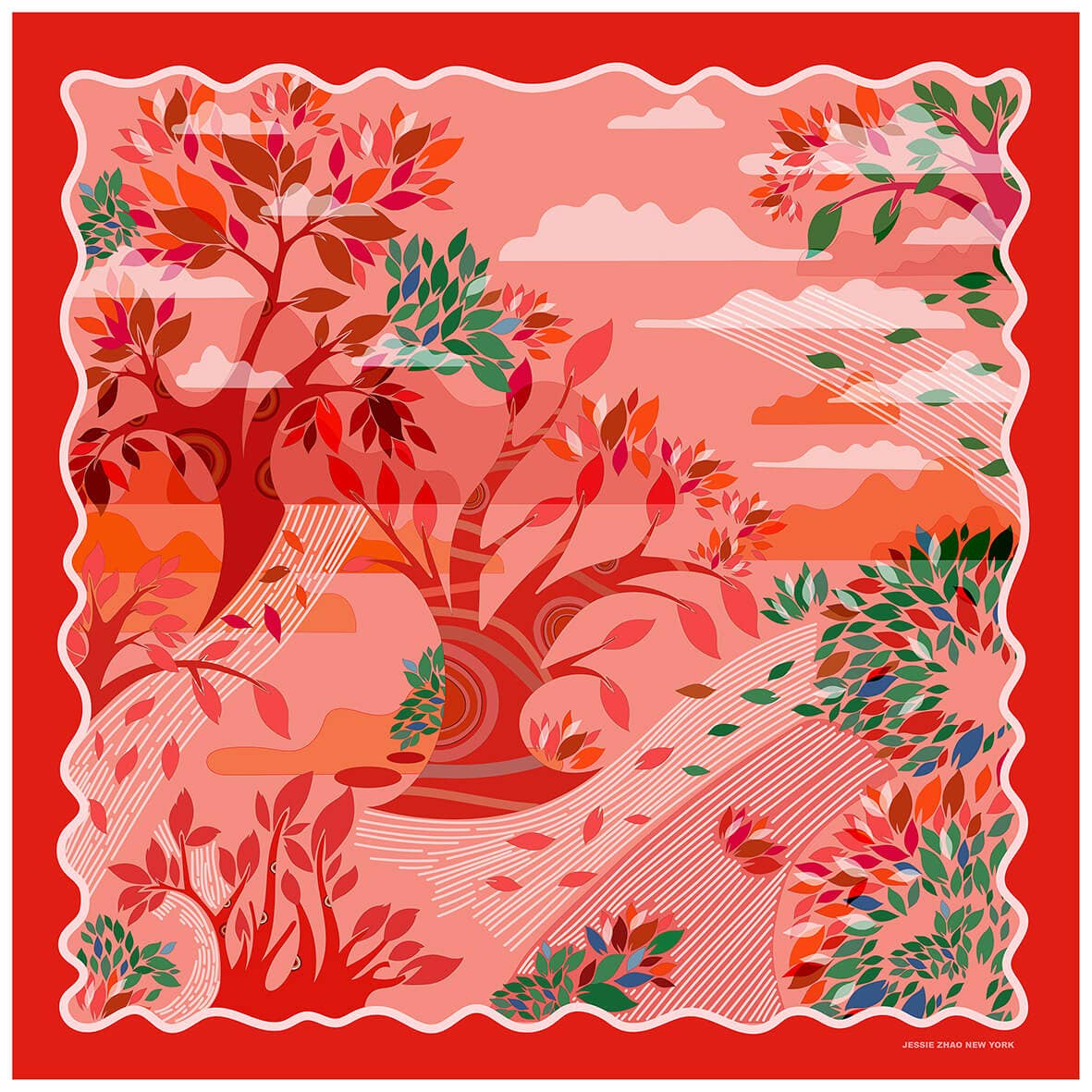 35"x35". This is a world made with different simple shapes and colors. Inspired by the puzzle. All different simple shapes reconstruct a beautiful world. Original hand painted. 100% Silk.