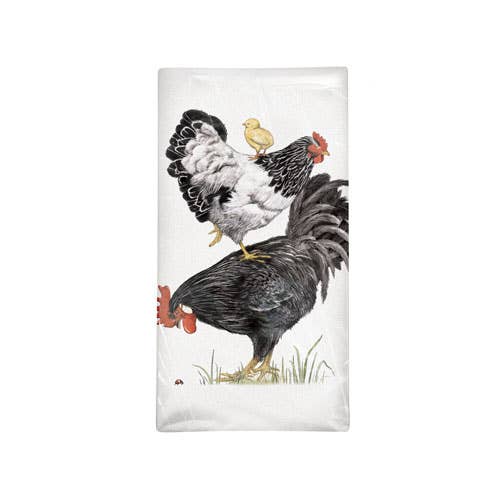 Outspoken little hen and her proud husband! 100% cotton flour sack fabric woven to our specifications – it’s lint free and gets softer every time it’s washed. 17" x 24", J-hook for easy display. Often ordered with VL31 Mama Hen, VL87 Kitchen Chicken, VL21 Rooster Deluxe, VL127 Flippin' Chicken