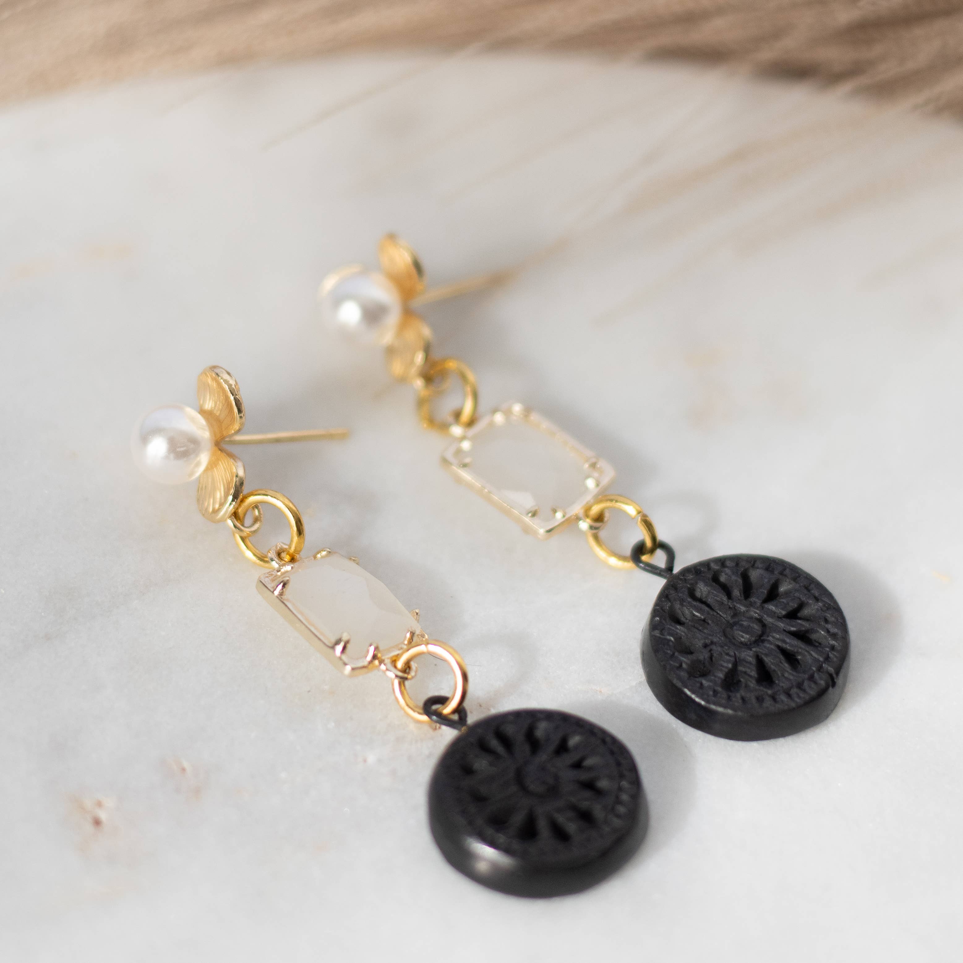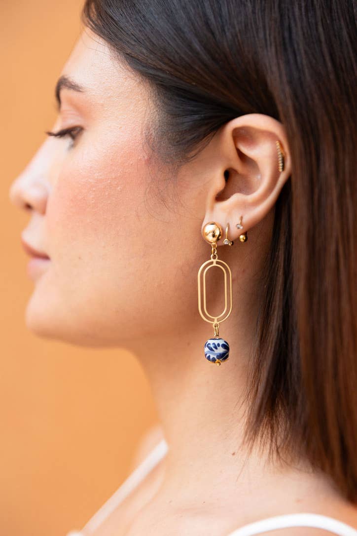 The Valeria drop earrings are a stunning fusion of Oaxacan heritage and contemporary design. Each pair is handcrafted by skilled artisans in Oaxaca, using barro negro, a rare black clay known for its deep, rich color and intricate carvings. Designed in Austin, these earrings feature 18K gold-plated accents, creating a striking contrast that is both bold and timeless. Lightweight and easy to wear, they offer effortless elegance for any occasion. Features: Artisan Craftsmanship: Barro negro takes several days to carve, burnish, and cure, ensuring each piece is crafted with precision and care. Size: 2 inches long & 1 inch wide Weight: 3 oz Material: Authentic black clay from Oaxaca Metal: 18K gold-plated accents, hypoallergenic, nickel-free Technique: Each piece is hand-carved, polished, and carefully finished with gold-plated details for a refined, sophisticated look. Please Note: Each pair is one-of-a-kind due to its artisanal nature, with slight variations that make it uniquely you