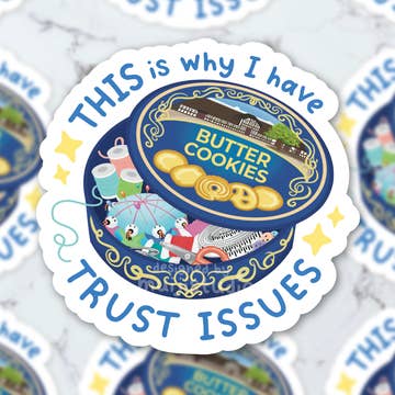"This Is Why I Have Trust Issues" - Butter Cookie Tin Sticker 🍪😆 If you’ve ever opened a butter cookie tin expecting sweet treats only to find sewing supplies instead, this sticker is for you! Featuring the iconic Danish butter cookie tin and a relatable message, this design is perfect for those who love a good laugh and a bit of nostalgia. 🤭💕 Size: 2.6in x 2.8in (great for laptops, water bottles, notebooks, and more!) Material: Durable, waterproof vinyl for long-lasting use. Finish: Glossy and vibrant colors to stand out. This sticker is a must-have for fans of quirky humor, sticker collectors, or anyone who’s been personally victimized by the sewing kit disguised as cookies. 😂🍪 Perfect For: ✅ Laptop decoration ✅ Water bottle fun ✅ Planners, bullet journals, or scrapbooking ✅ Gifting to family or friends who share the cookie tin betrayal Actual product color may vary slightly from the images shown.
