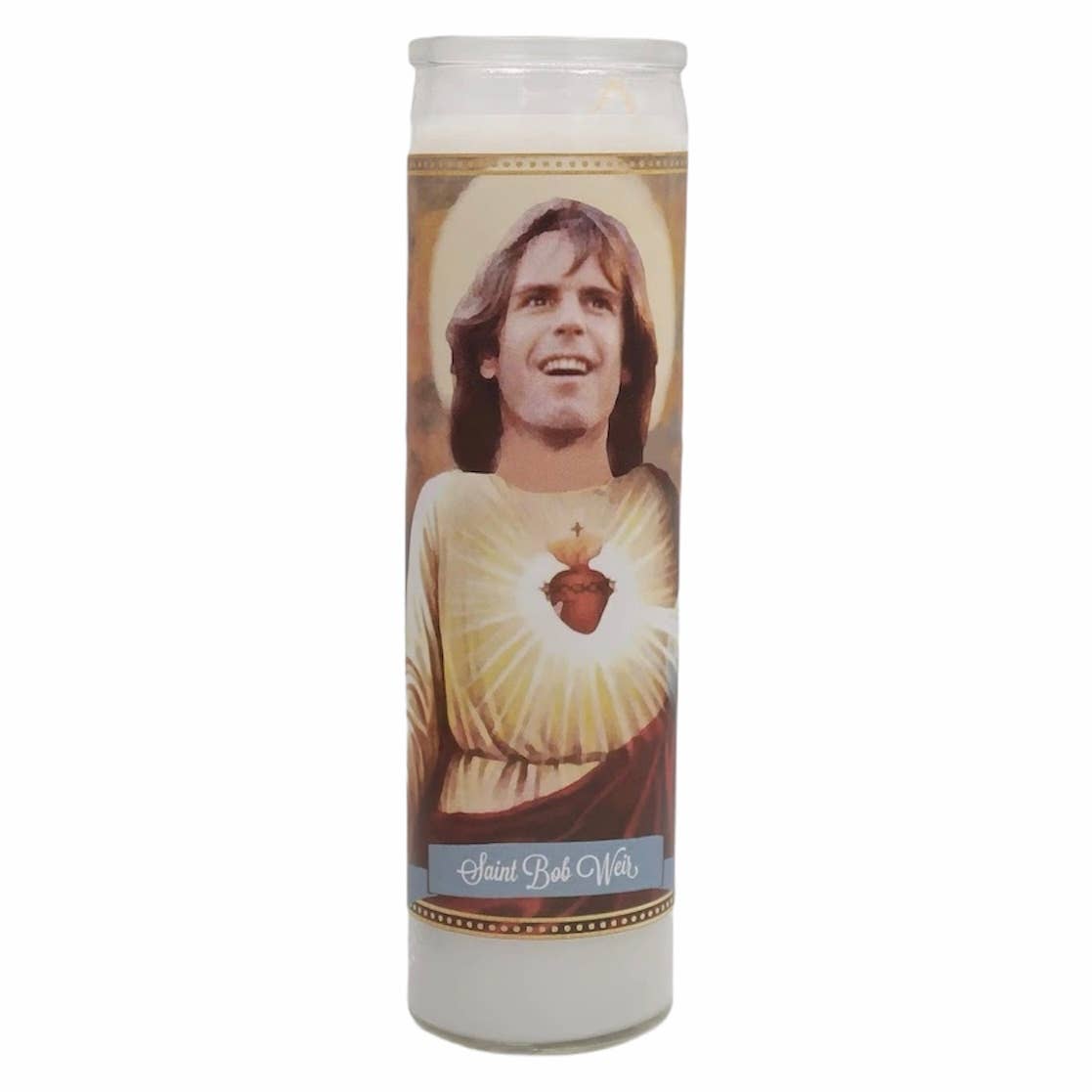 Tall white candle, hand poured in Mexico, design and assembled in the USA. Candle is unscented. Jonathan Van Ness JVN inspired parody art prayer candle.