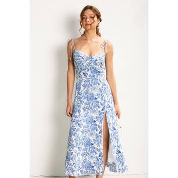 PRODUCT DETAILS * Chiffon maxi dress * Square neckline * Smocked bodice * Short puff sleeve with ruffled detailing * Made in India FIT & MODEL DETAILS * Length: 53 1/2" * Model measurement: * Height: 5'9" * Wearing size small MATERIAL & CARE * 100% Polyester * Hand wash only * Imported