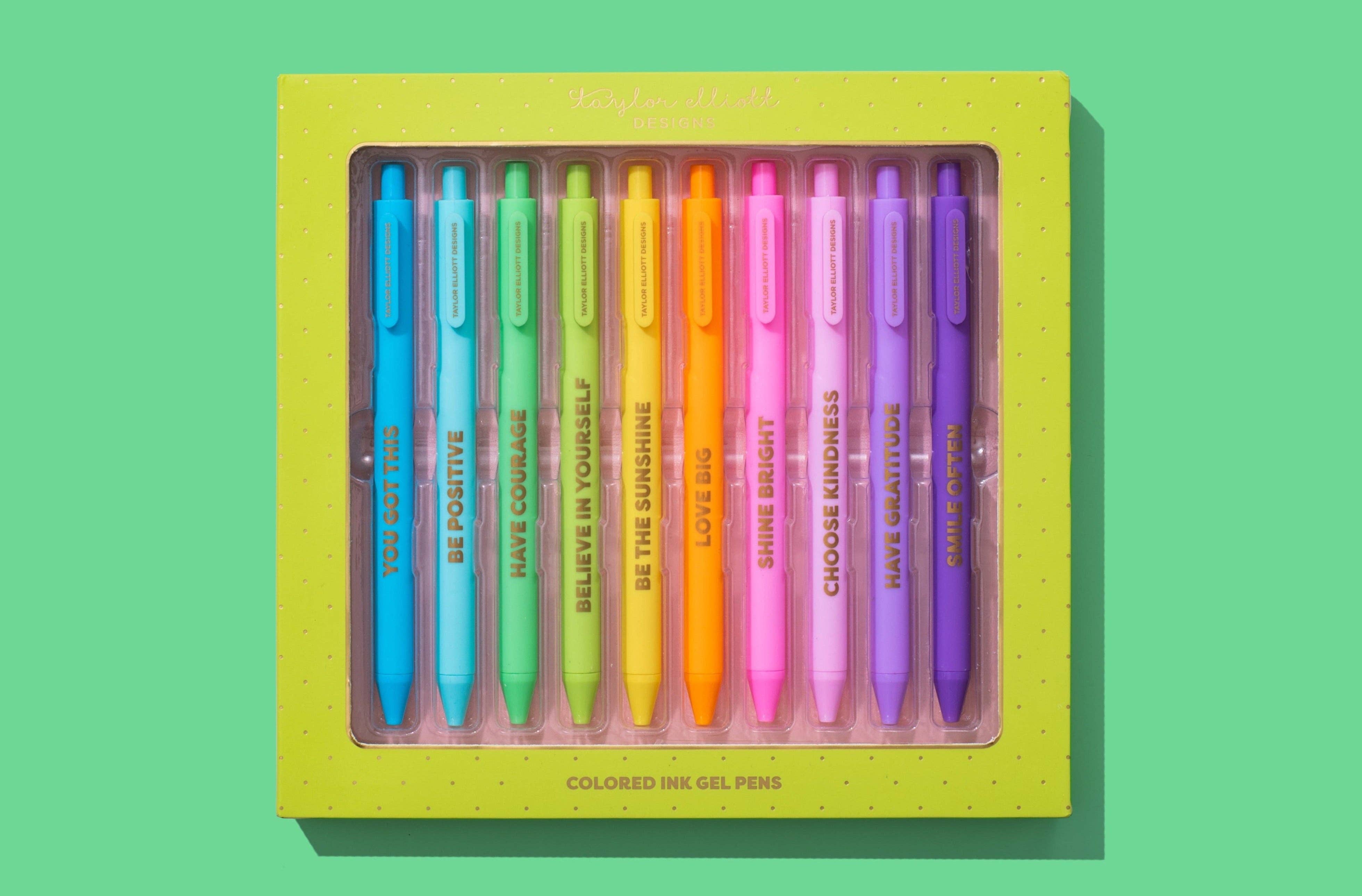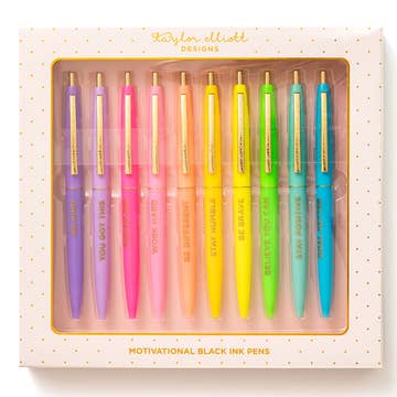 This pen set comes with 10 motivational and empowering phrases on different colored pens and super cute packaging, making it a thoughtful gift for birthdays, friendship gifts, or for someone who could use a boost of encouragement. Pair this set with one of our notepads to make the gift even more special! Details * 10 pens * Box size: 8" x 7.5" x 0.75" * Gold foil imprinting * Medium ball point * Black ink * White gift box packaging with gold foil dots * Imported Pen Sayings: Be Kind You Got This Dream Big Work Hard Be Different Stay Humble Be Brave Believe You Can Stay Positive Goal Getter Whether it's a NYE party accessory, Galentine's day gift, or a present for your sweetie, Taylor Elliott has what you need to make winter season celebrations memorable!
