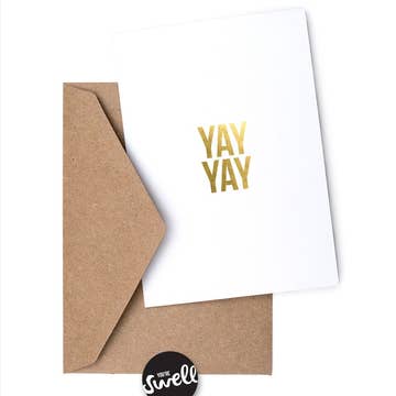 From the Six Letter Sentiments collection. Who says you can't speak volumes with only six letters? A short and sweet way to say hello. This smooth, white card (100 lb. stock) is blank inside, and finished with luxe gold foil. Includes a kraft paper envelope. Packaged in a clear cellophane sleeve for protection. DIMENSIONS Card measures 4.25 in. x 5.5 in. SHIPPING Ships in a protective mailer to prevent bending. © 2022 Swell Made Co. All rights reserved.