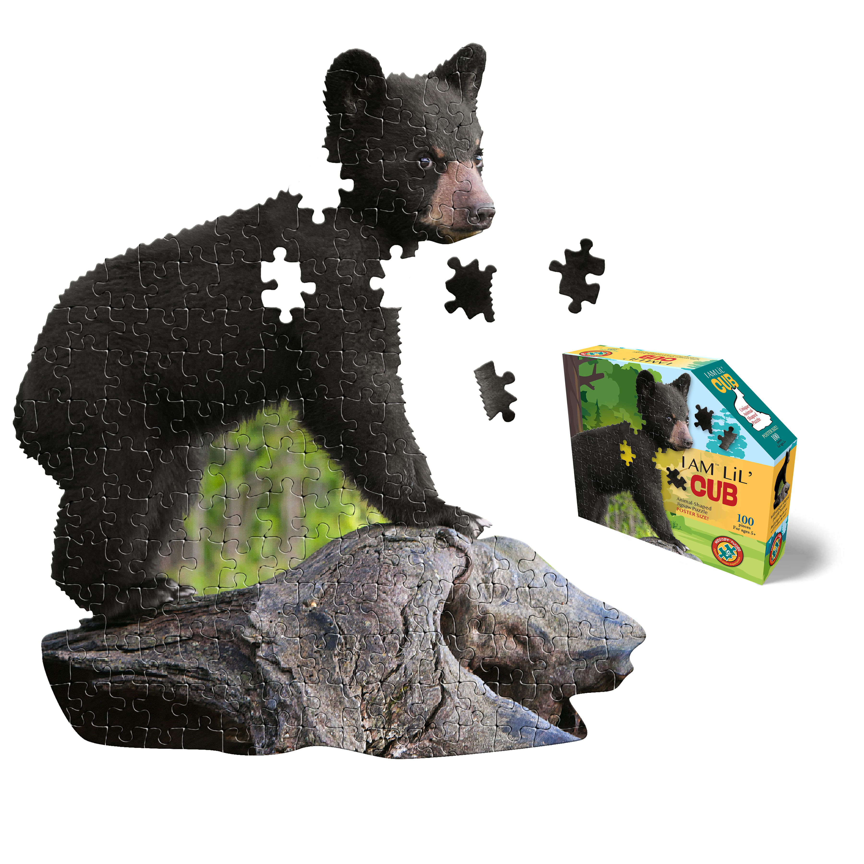 Madd Capp Puzzle - I AM Bear Try the Great Black Bear If You Dare! Unique, animal head-shaped, 550-piece jigsaw puzzle for ages 10 and up. Poster size! Each puzzle comes with an educational Fun Facts insert. On one side is a fold-out puzzle image to hang as a poster or use as a reference. On the flipside is a wealth of amazing facts. Did you know, for instance, that black bears have the ability to survive without food for up to seven months during hibernation? Content: 550 pieces Finished size: 27” x 27” (poster size) A big, beautiful challenge! Perfect gift! Unique animal head-shaped border Interlocking puzzle pieces High gloss, photo-realistic animal image Premium quality chipboard - Dust-free! For ages 10 and up. Dimension - 11.5" x 9.5" x 3" Weight - 2.09 I AM Bear is also available as a 300-piece puzzle (16" x 16" finished size).