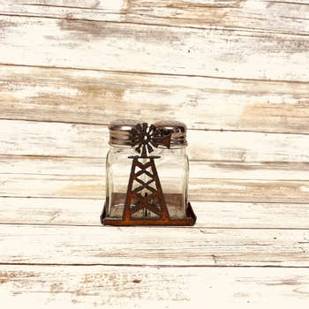 Salt and Pepper metal caddy that is colorfully painted with assorted colors. Comes with the two glass shakers. Rustic charm and functional design. This small unique design is perfect for keeping salt and pepper at your fingertips. Also ideal for RV living. Whether for large gatherings or small intimate dinners, it's an ideal addition to your kitchen essentials. Made using reclaimed American made steel that is weathered by the sun and built in the USA by a small batch maker. Whimsies studio is in Texas.