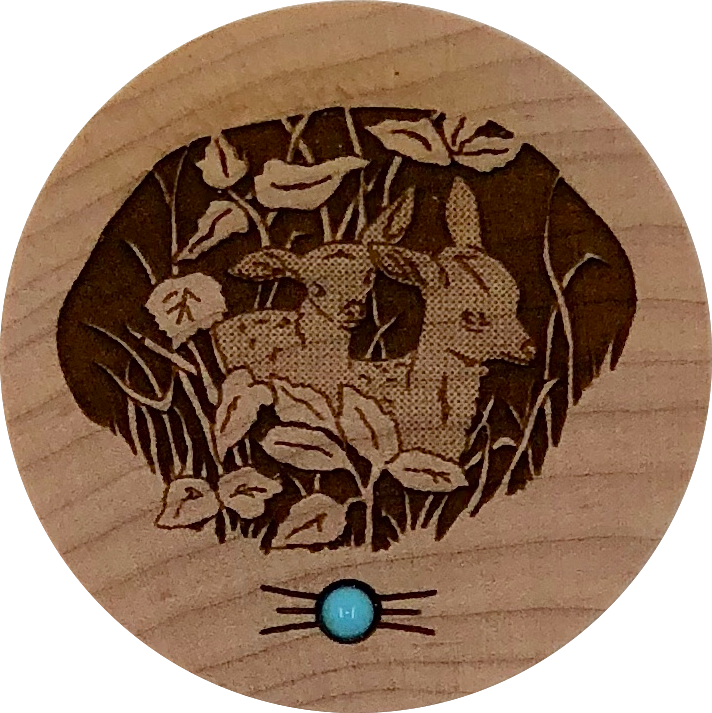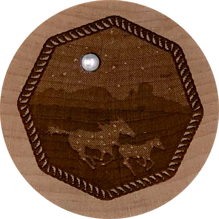 Wolves on small maple box w/ mother of pearl. Approx 1 1/2" in diameter