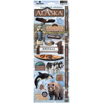 Size 4-1/8" x 4" Image Description: a vinyl sticker in the shape of Denali National Park, the white text "DENALI" across the front, smaller motifs of various mountains, and large animals are around the text All images, products and designs © Noteworthy Paper & Press