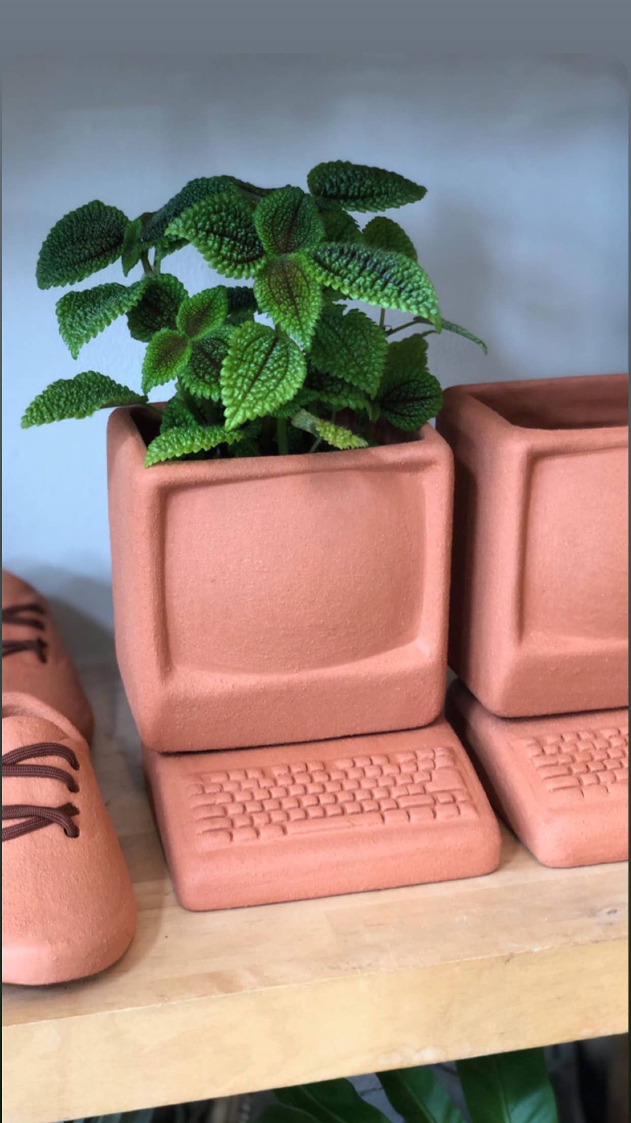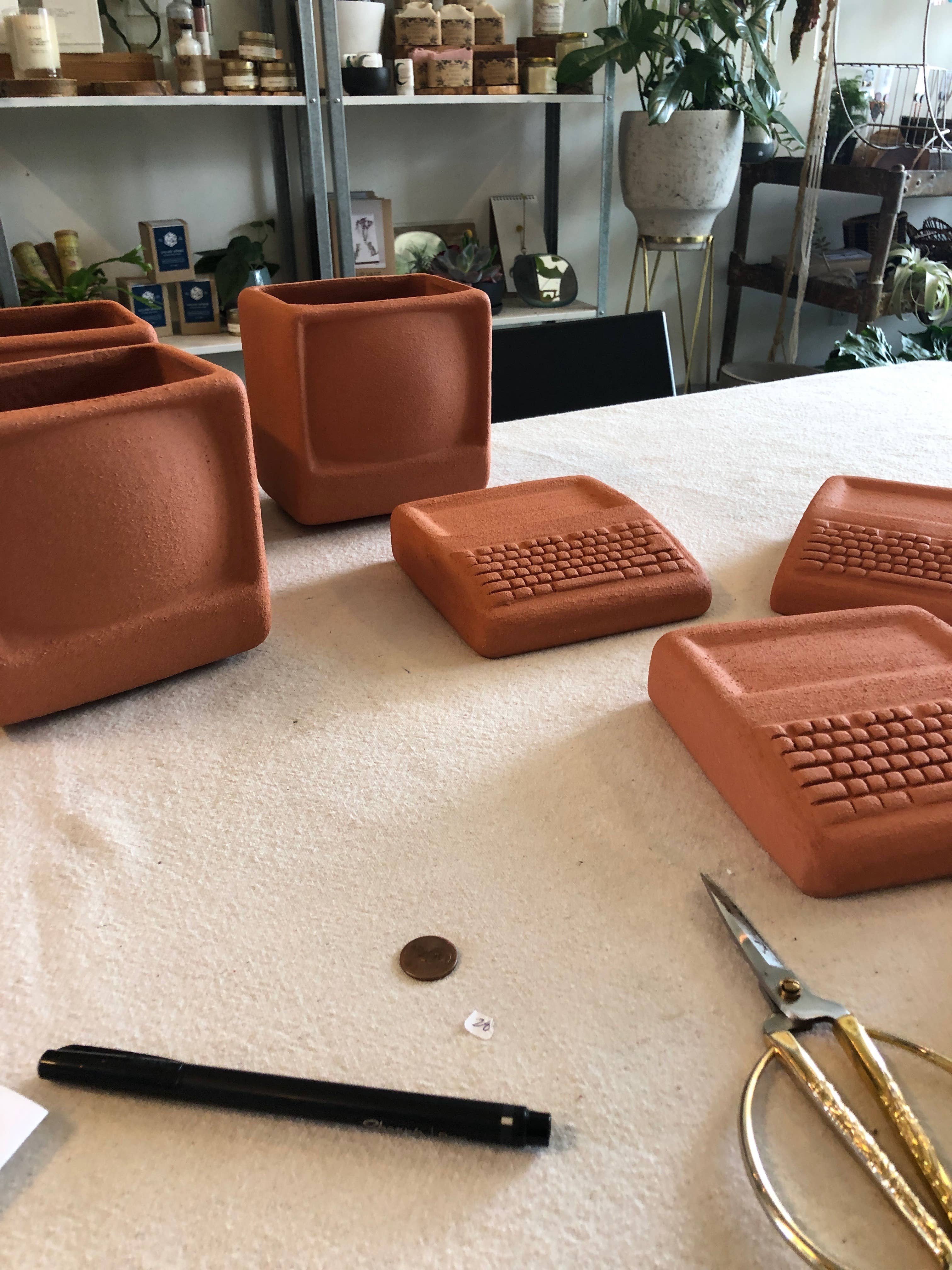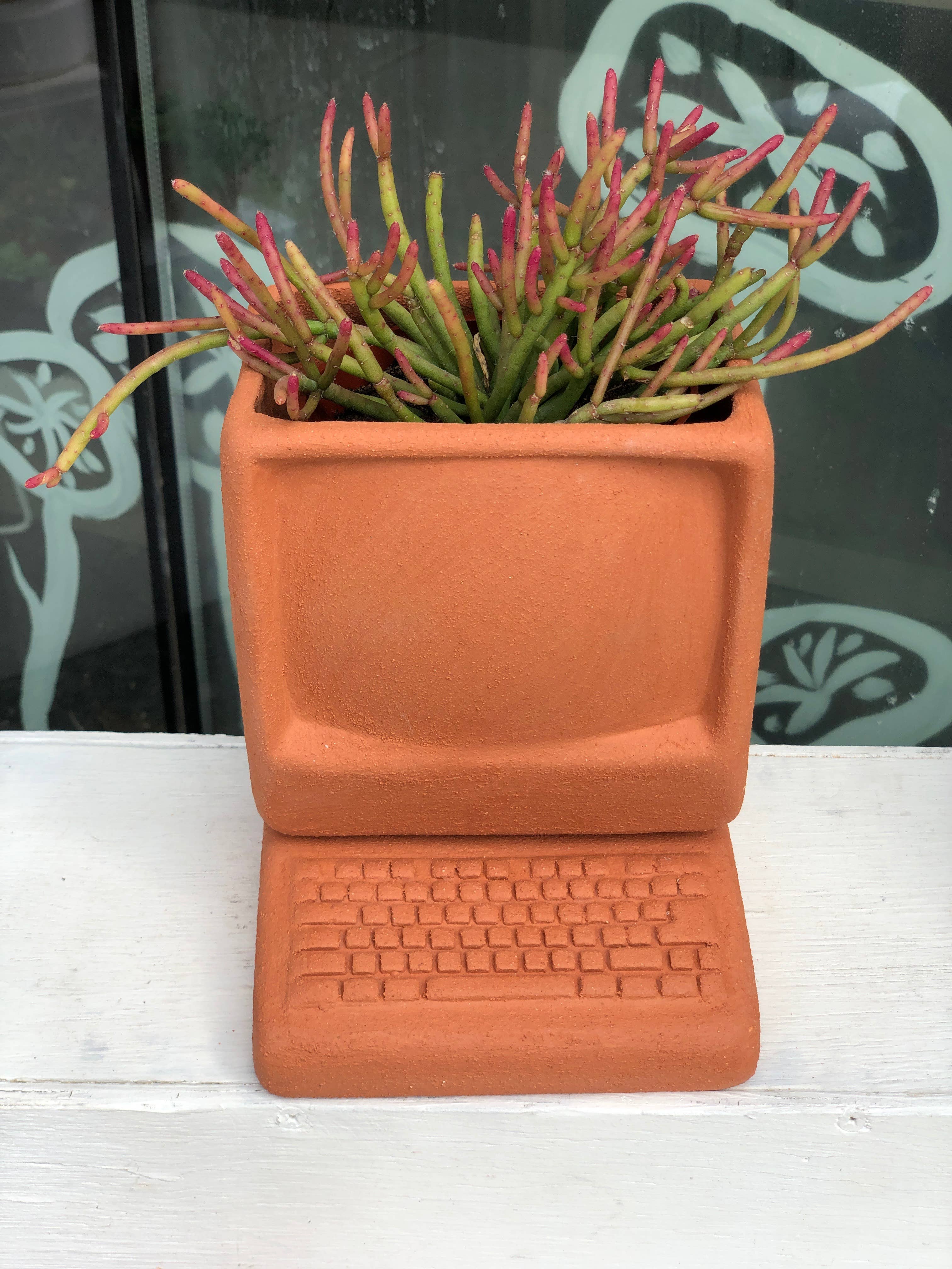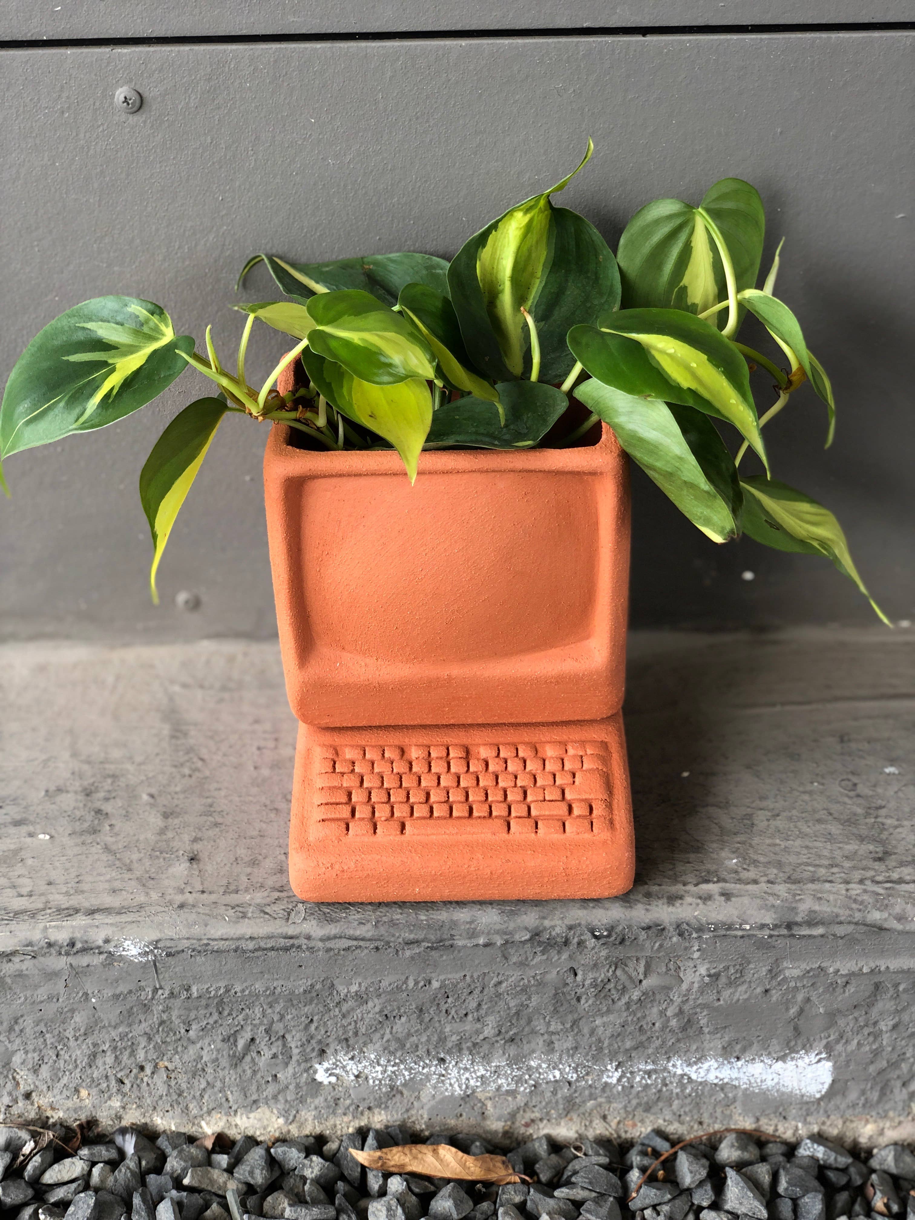 How much more can you jazz up that snake plant? A lot more. The Computer Planter is inspired by the chunky aesthetics of the early 1980s and makes for a great conversation piece. The Computer comes in two parts: the keyboard acting as a saucer and the monitor being large enough to house a small-sized plant Material: Terra Cotta. Colored pieces are matte underglaze on Terra Cotta