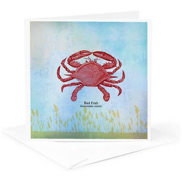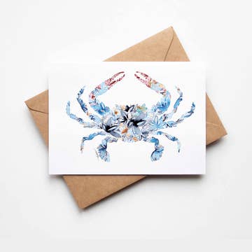 Feeling crabby? This blue and white crab embodies island life and shows off several hues of nautical blue in a vintage-inspired painted texture. Size: A2 / 5.5”x 4.25” blank note card Material: Sturdy white recycled cover stock Process: Full-color Count: Single blank note card Features: Includes a clear protective sleeve Envelope: Recycled Kraft Origin: Made in the USA Made in United States of America