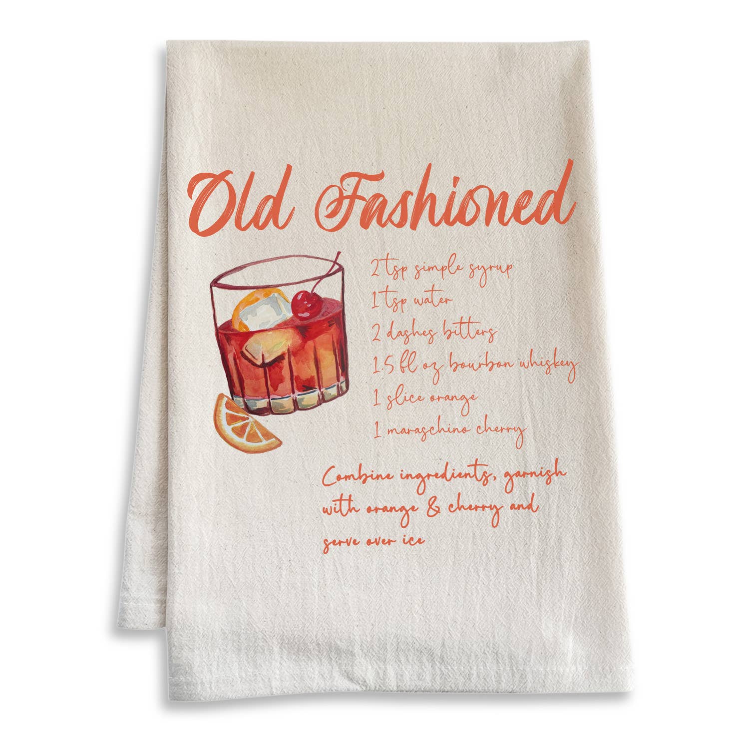 Spiced Old Fashioned - The perfect classic cocktail recipe. Delicious flour sack cocktail recipe tea towels to liven up any kitchen or bar! • Towel is 28"x30" • 100% Indian Floursack Cotton • Printed in California