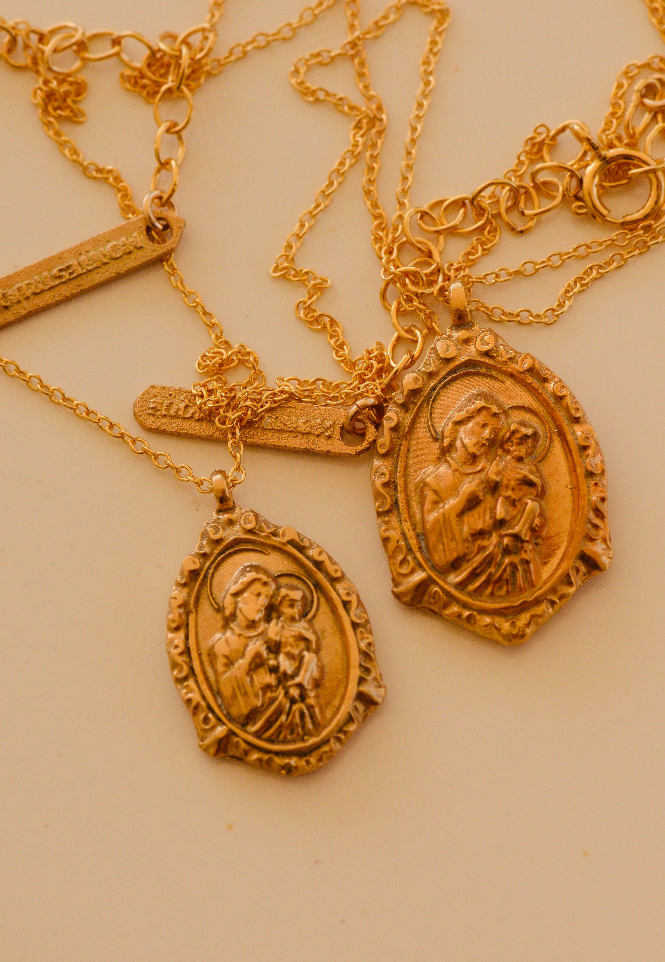 Handcrafted coin medallion completed with an etched cross. Finished with a 14k gold filled chain, Sterling silver.