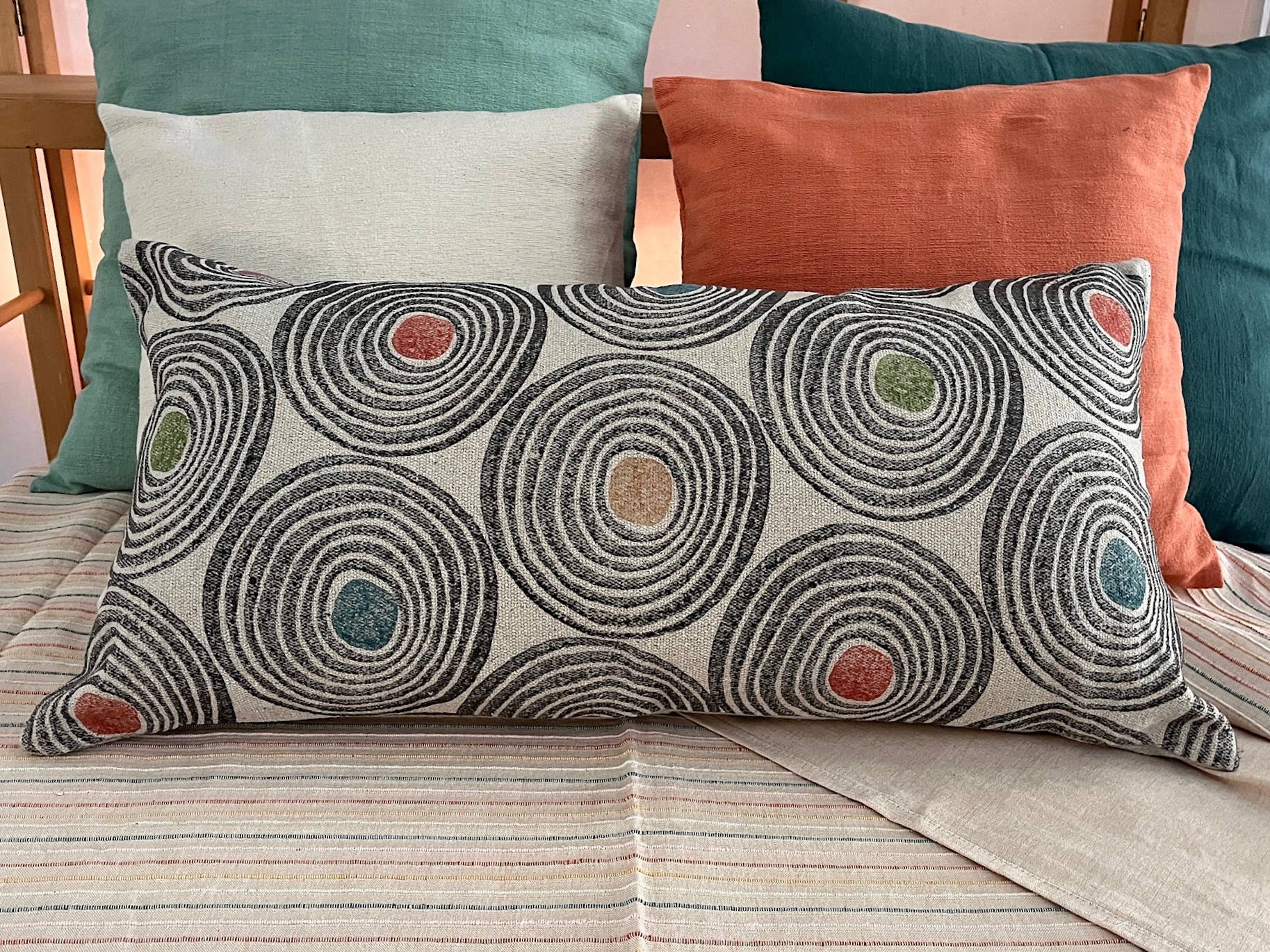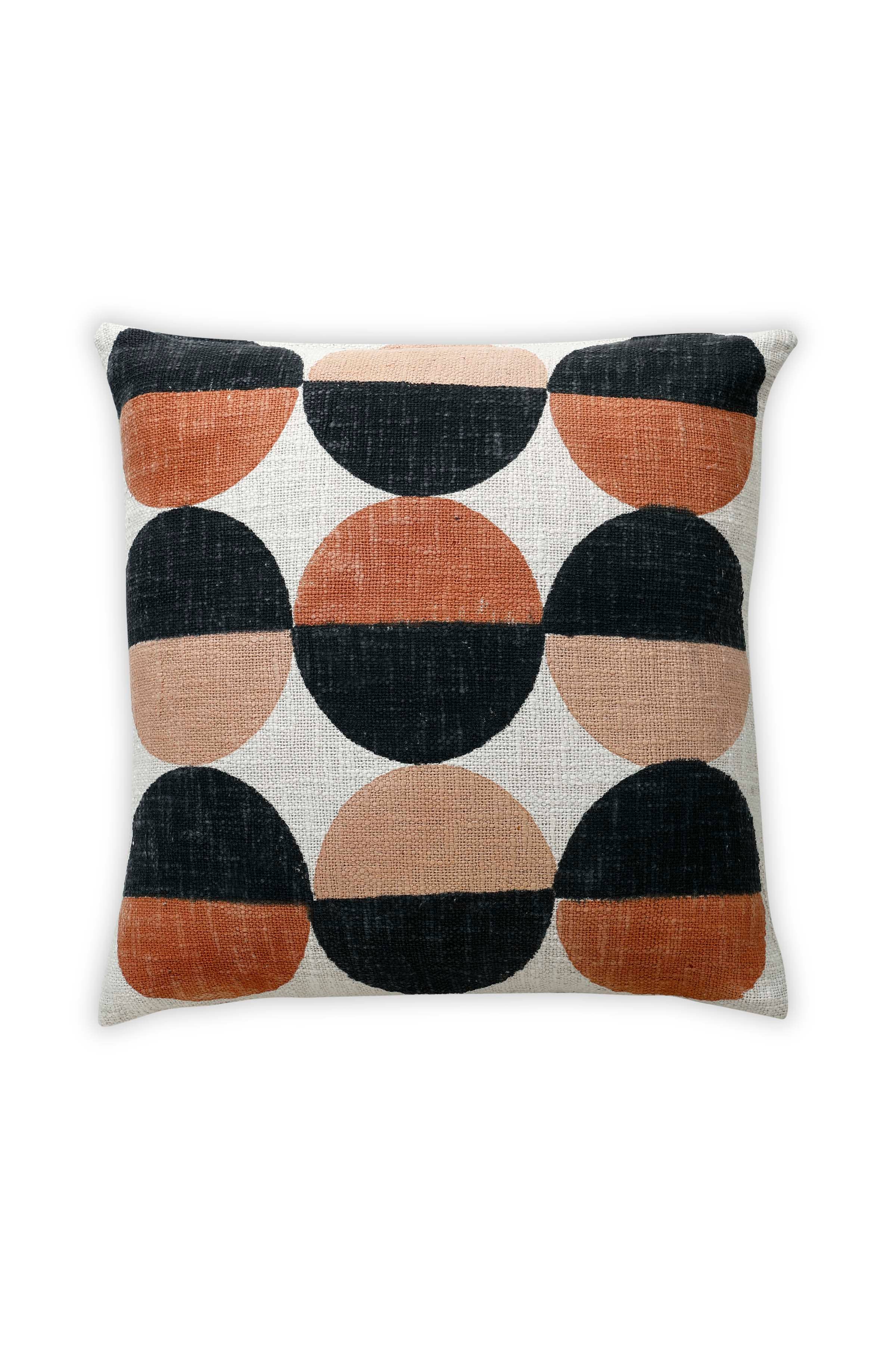 Our Block Printed Circle Lumbar throw Pillow is handprinted using blocks by talented artisans, you can be assured of the level of quality and care that goes into the design. The artisans use traditional hand block printing techniques to bring you a colorful, modern design with a global feel. This pillow is part of our Aakar collection. A collection inspired by medley of patterns and colors inspired by vintage of Indian architecture. Elements like jharokha, jaal, tiles, stepwell are used as forms to leave an imprint using hand block and screen printing onto the soft, textured cotton. This pillow is part of our Aakar collection. A collection inspired by medley of patterns and colors inspired by vintage of Indian architecture. Elements like jharokha, jaal, tiles, stepwell are used as forms to leave an imprint using hand block and s • Ethically made in India • Cotton construction • 12x30 inch • YKK golden zipper • Available with and without insert • Perfect for Fall & Home Decor