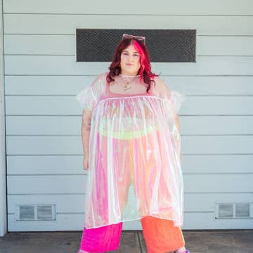 This dress brings playful charm and structure, adding just the right amount of festive volume and personality to every look. Layer over everything for everyday magic. - 100% polyester organza - Machine wash cold, air dry or tumble dry low - Lightweight and luxe sheer blue iridescent polyester organza - Puff sleeves and slight high-low hem for flow + movement - Freeform oversized fit – no cling, all glam - Keda, 5'2", 60" bust/54" waist/65" hip, wears OS+ - Angie, 5’ 9.5”, 41.5” bust/37” waist/41” hips wears OS Hits above the knee on some, closer to midi on others depending on your proportions. Draped in shimmery organza, this dress is loose, luxe, and perfectly effortless. It’s all the party glam without the fuss—just pure, sparkling magic!