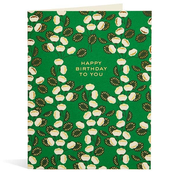 Let this elegant and playful arrangement of leaves with elegant silver foil bring a colourful splash to your birthday greeting. - A2 size (4-1/4"x 5-1/2" when folded) - Blank inside - Offset printed in Toronto on natural-white, heavyweight, textured paper - Die-cut with rounded corners - Matching envelope included SKU: 1324-BF