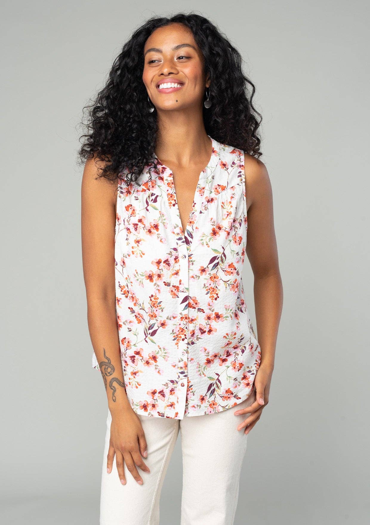 Floral mini dress with a ruffled split neckline and flutter cap sleeves. Features a functional button front and side pockets. The perfect loose-fitting mini dress for Spring.