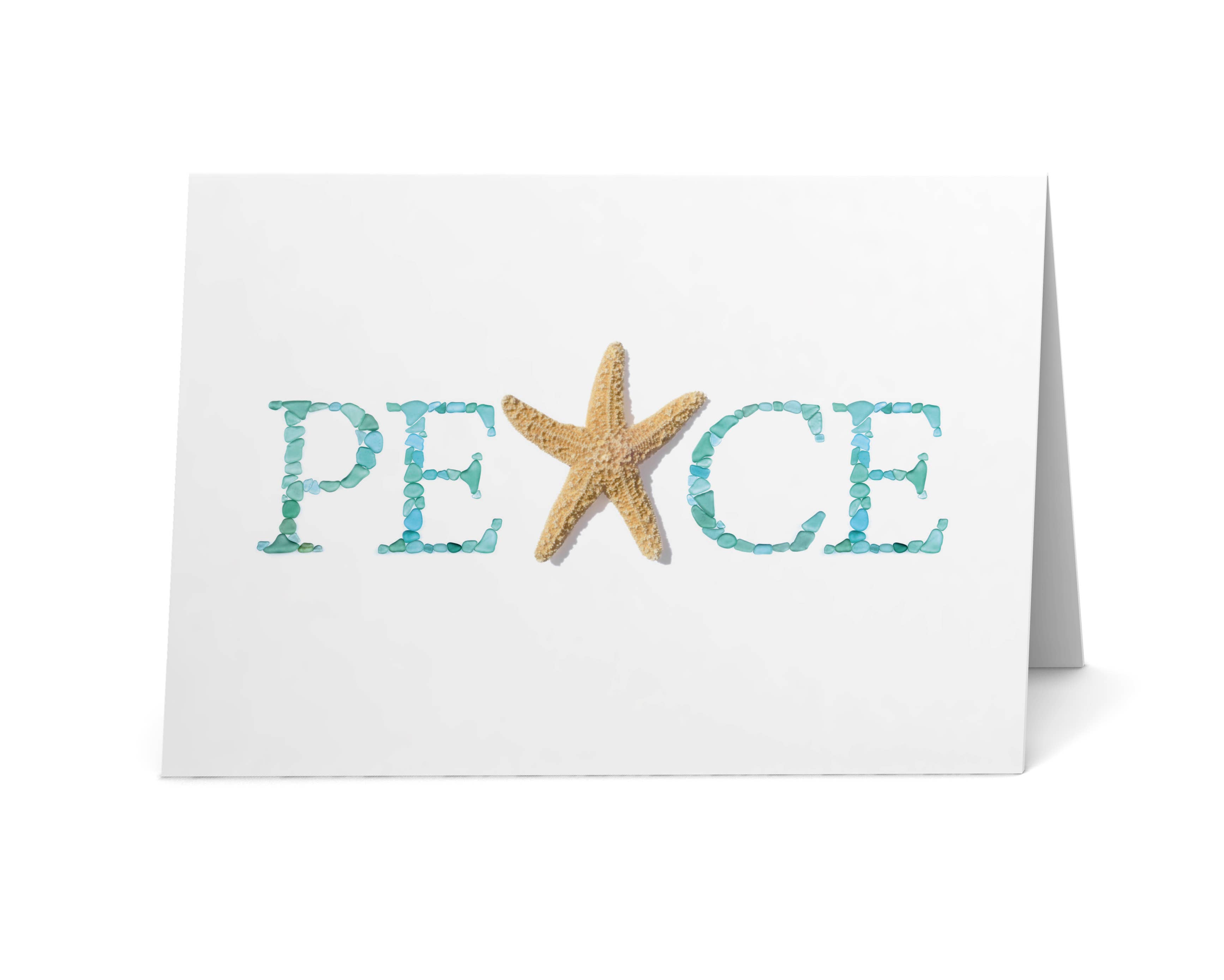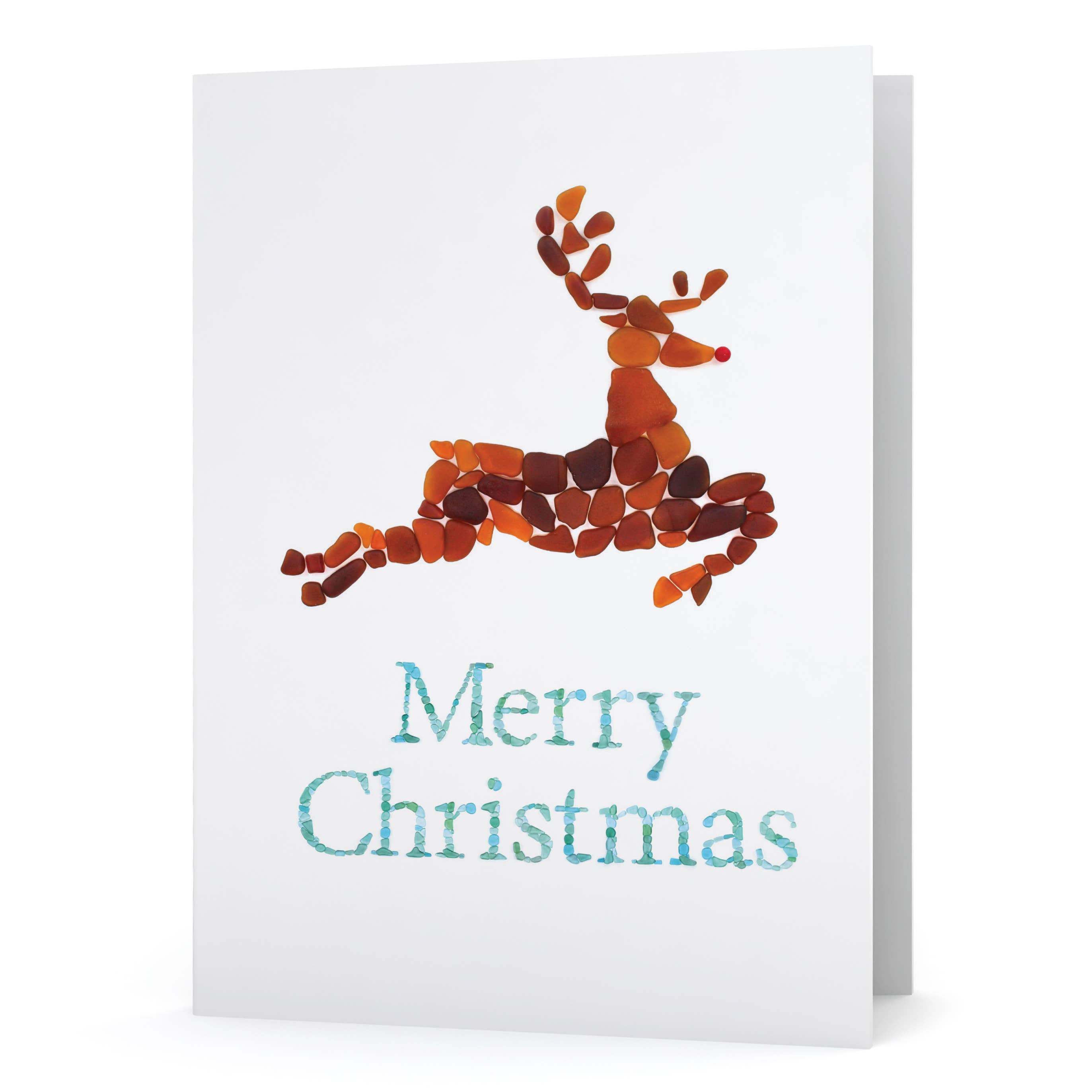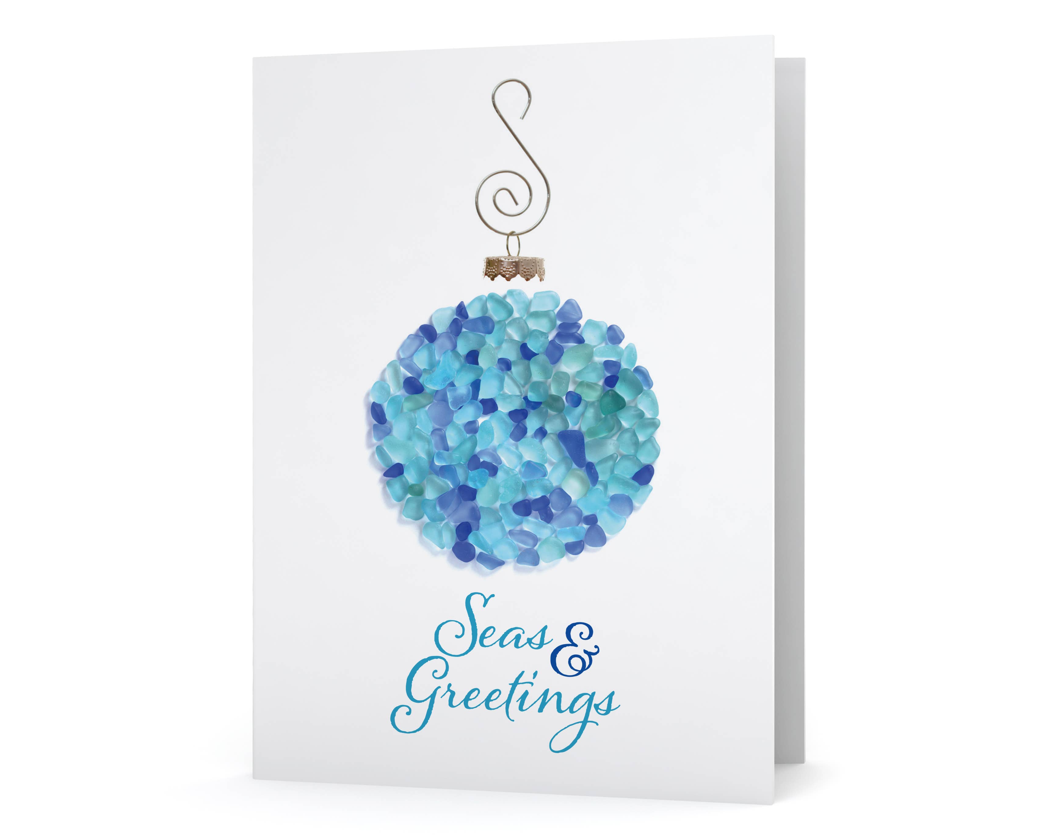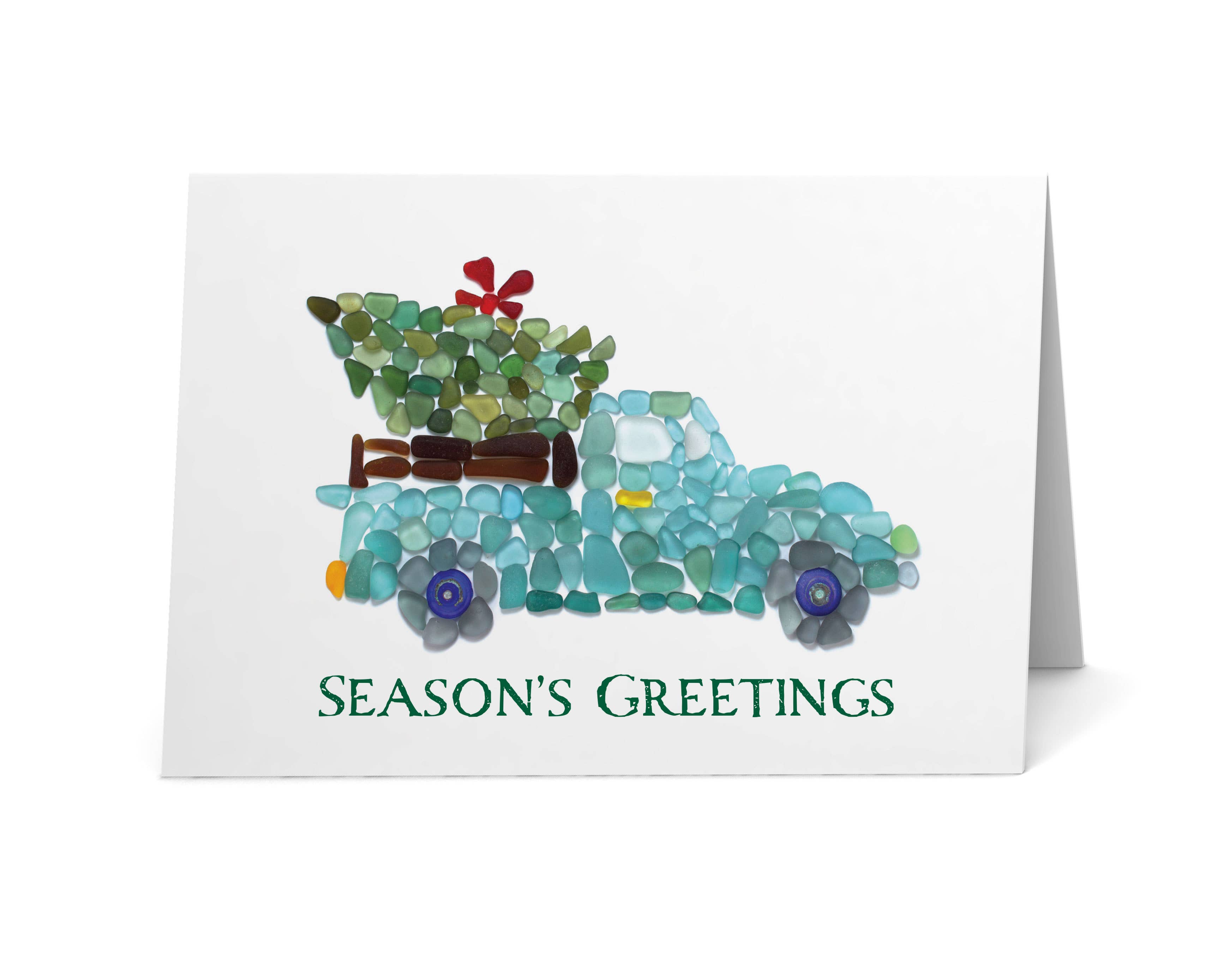 This sea glass art design on this holiday card was created with surf-tumbled pieces of beach glass. The mosaic was photographed and is printed on matte, heavyweight, bright white card stock. Blank inside. Each card is individually packaged with an envelope in a clear, protective sleeve. Note: The high-quality print looks real, but it is not actual sea glass.