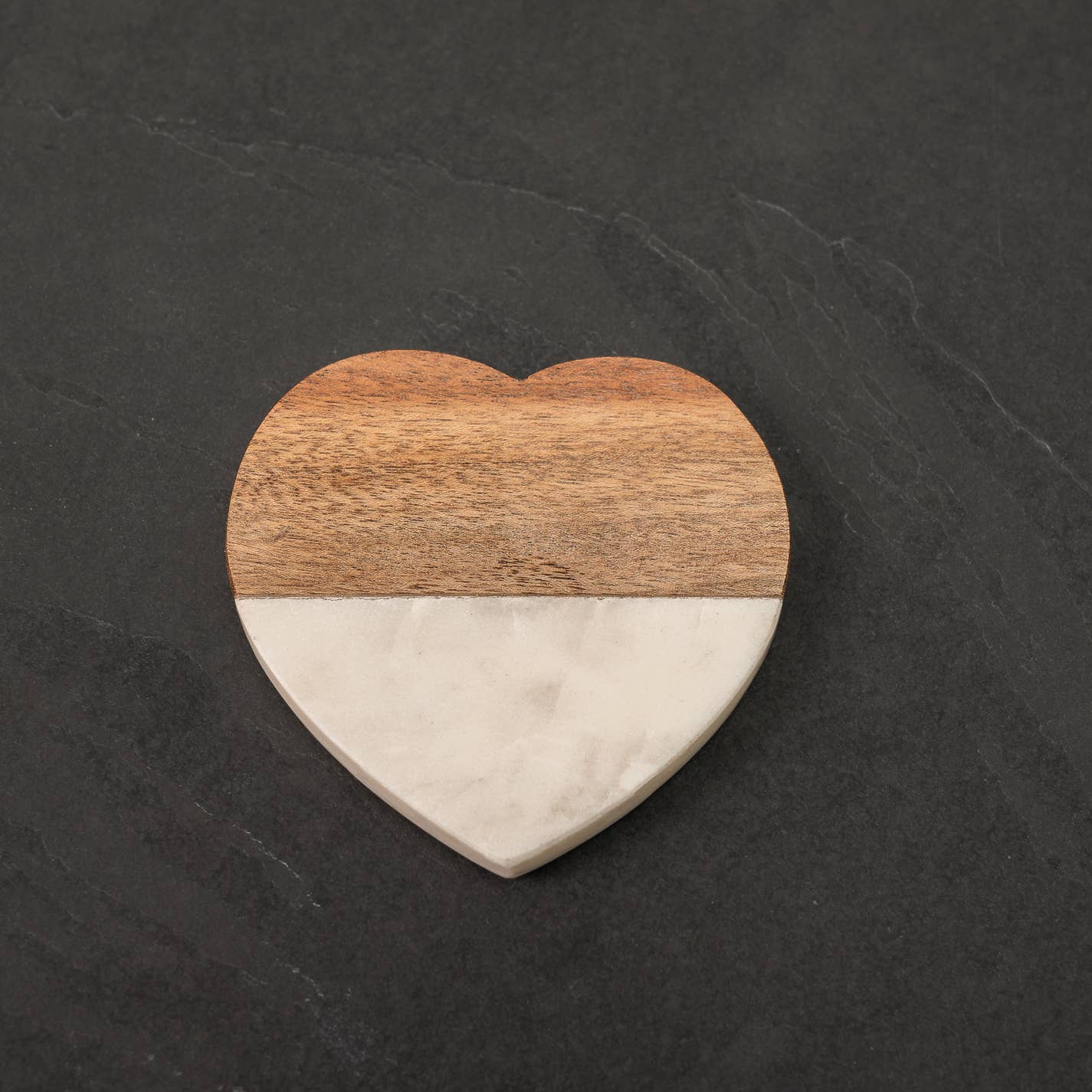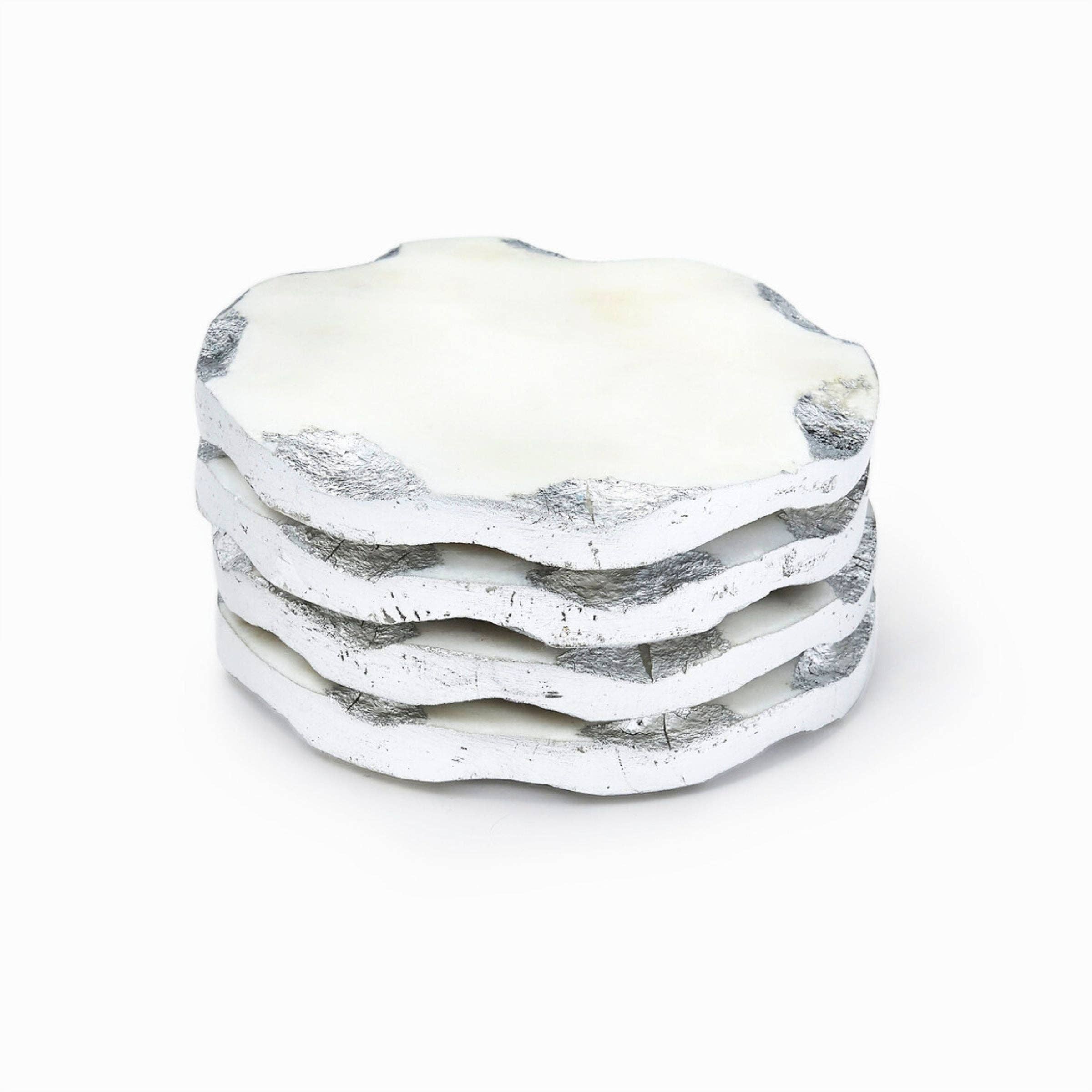 TLC for your table! An array of six natural marble coasters makes a rock-solid gift for the hostess-with-the-mostest! Each heart-shaped coaster is a different color. Three are edged in silver; the other three in gold. Cork bottoms protect tables from drips and rings. Set of 6 comes with a velvety black bag for easy gifting. Handcrafted of food-safe natural marble. Product Max Depth (Front to Back): 4.5". A great idea for a Valentine's Day gift!