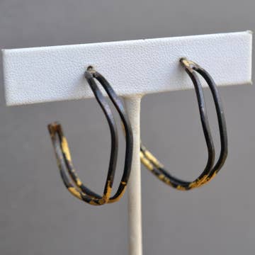 Wavey organic hoops in steel and gold. These unique free hoops are formed from brazed and forged steel wire and accented with 23k gold leaf. The steel has been blackened with heat to turn a rich dark gunmetal color which contrasts nicely with the gold. Hoops have sterling silver posts and backs and measure around 1.25 inches in diameter. Also available in a larger 2 inch version.