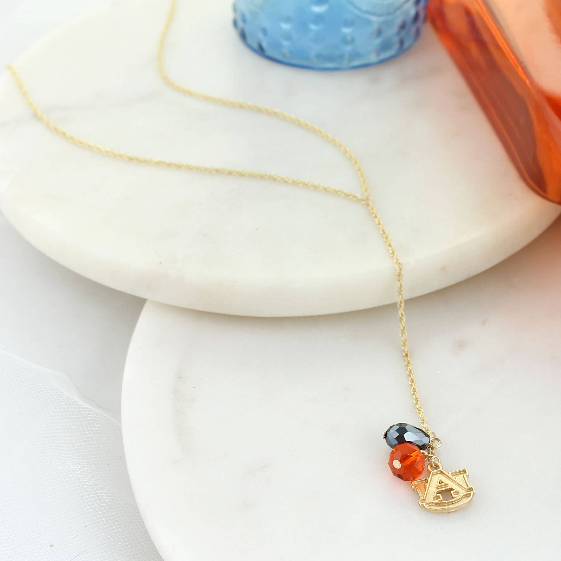 Matte gold hoop earrings featuring orange and navy crystal beads, a matte gold disc, and a matte gold Auburn logo charm. Hoops are 1.5” in diameter. This is an officially licensed product.