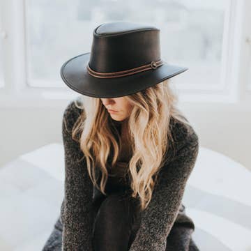 Leather Outback Hat combines rugged style with classic charm. Crafted from midweight cowhide leather, this medium-brim hat features a leather band with a side concho, perfect for men seeking durability and a bold, timeless look. Material: Midweight USA Raised Cowhide Leather Shape: Outback Trim: Leather Band with Side Concho Brim Size: 2 3/4” Crown Height: 3 3/4” Sweatband: AHM Velcro Assembled in the USA Australian outback hat, leather outback hat, crushable outback hat, men hats, women hats, leather hats, summer hats, wool hat, genuine leather, Safari hat, western hat, Kodiak hat, Pendleton outback hat, packable hat, hiking, spring, summer, fall, Christmas gift, thanksgiving, hats for him, hats for her, sun protection, handmade