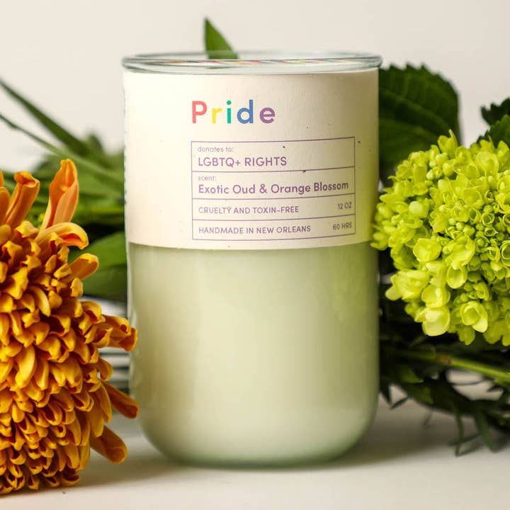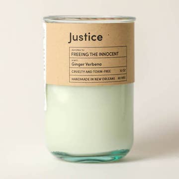 This earthy, lifting scent raises funds for Innocence Project New Orleans, which works to free innocent, life-sentenced prisoners at no cost to them or their loved ones. Fill your home with this lovely scent while helping IPNO seek justice for the wrongly convicted. Our 12 oz. candles are hand-poured into recycled glass jars and made of eco coconut soy. They have a 60-hour burn time. Dimensions: 5" Height, 3" Diameter